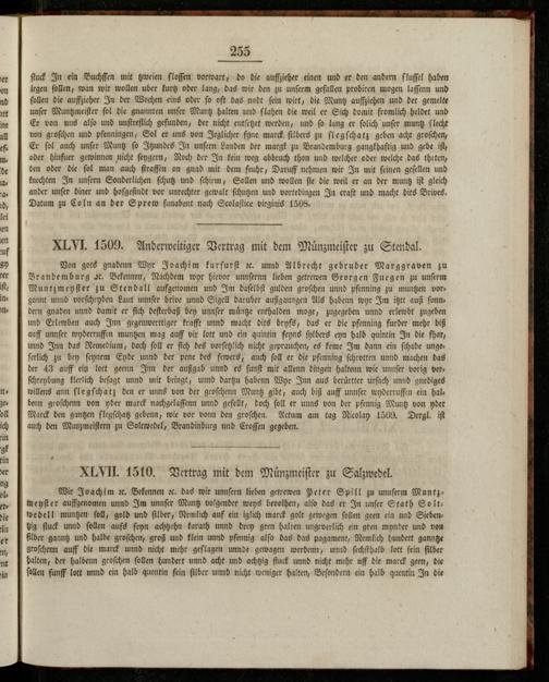 Von gots gnadenn Wyr Joachim kurfurſt ꝛc. unnd Albrecht gebruder Marggraven zu Brandemburg 2c. Bekennen, Nachdem wyr hievor unnſernn lieben getrewen Georgen Fuegen zu unſerm Muntzmeyſter zu Stendall aufgenomen und Im daſelbſt gulden groſchen unnd pfenning zu muntzen vorgonnt unnd vorſchryben Laut unnſer brive unnd Sigell daruber außganngen Als habenn wyr Im itztt auß ſonndern gnaden unnd damit er ſich deſterbaß bey unnſer muͤntze enthalden moge, zugegeben unnd erlewbt zugeben und Erlewben auch Inn gegenwerttiger krafft unnd macht dits bryfs, das er die pfenning furder mehr biß auff unnſer wyderruffen muntzen mag auff vir lott und ein quintin feyns ſylbers eyn halb quintin In die fhar, unnd Inn das Remebium, doch ſoll er ſich des vorſetzlich nicht geprauchen, es keme Im dann ein ſchade ungeferlich zu bey ſeynem Eyde unnd der pene des fewers, auch ſoll er die pfenning ſchrotten unnd machen das ber 43 auff ein lott geenn Inn der außgab unnd es ſunſt mit allenn dingen haltenn wie unnſer vorig vers ſchreybung klerlich beſagt unnd mit bringt, unnd dartzu habenn Wyr Inn aus beruͤrtter urſach unnd gnediges willens ann ſlegſchatz den er unns von der groſchenn Muntz gibt, auch biß auff unnſer wyderruffen ein hal benn groſchenn von yder marck nachgelaſſenn unnd gefellt, doch ſoll er unns von der pfennig Muntz von yder Marck den gantzen ſlegſchatz gebenn, wie vor vonn den groſchen. Actum am tag Nicolay 1509. Dergl. iſt auch den Munzmeiſtern zu Soltwedel, Brandinburg und Croſſen gegeben.
