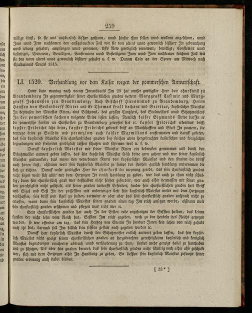 Hewt dato mantag nach vocem Jocunditatis Im 20 hat unnſer gnedigſter Herr der churfurſt zu Brandemburg In gegenwertigkait feiner churfurſtlichen gnaden vettern Marggraff Caſimir und Marggraff Johannßen zeu Brandemburg, Auch Biſchoff Hieronimus zu Brandemburg, Herrn Hanßen von Seckendorff Ritter und Er Thomas krull dechant und Secretar, kayſerlicher Maieſtat In beyweſen irer Maieſtat Reten, eins Biſchoves, des groſſen Cantzlers, des Stalmeiſters unnd Schatzmeiſters In der pomeriſchen ſachenn volgende Brive leßen laſſen, Nemlich kaiſer Sigmunds Brive darIn er die pomeriſche furſten an churfurſten zu Brandemburg gewyſen hat 2c. kayſer Fridrichs erkentnus briff, kayßer Fridrichs lehn brive, kayßer Fridrichs gebotes briff an Manſchafften und Stett In pomern, die vertrege brive zu Soldin und premtzlow auch kaißer Maxmilians confirmacion und daruff gebeten, das fein kayſerlich Maieſtat fein churfurſtlichen gnaden bey ſolchen alten hergebrachten kaiſerlichen und königlichen begnadungen und freiheiten gnediglich laſßen ſchutzen und ſchirmen wol u. ſ. w.
