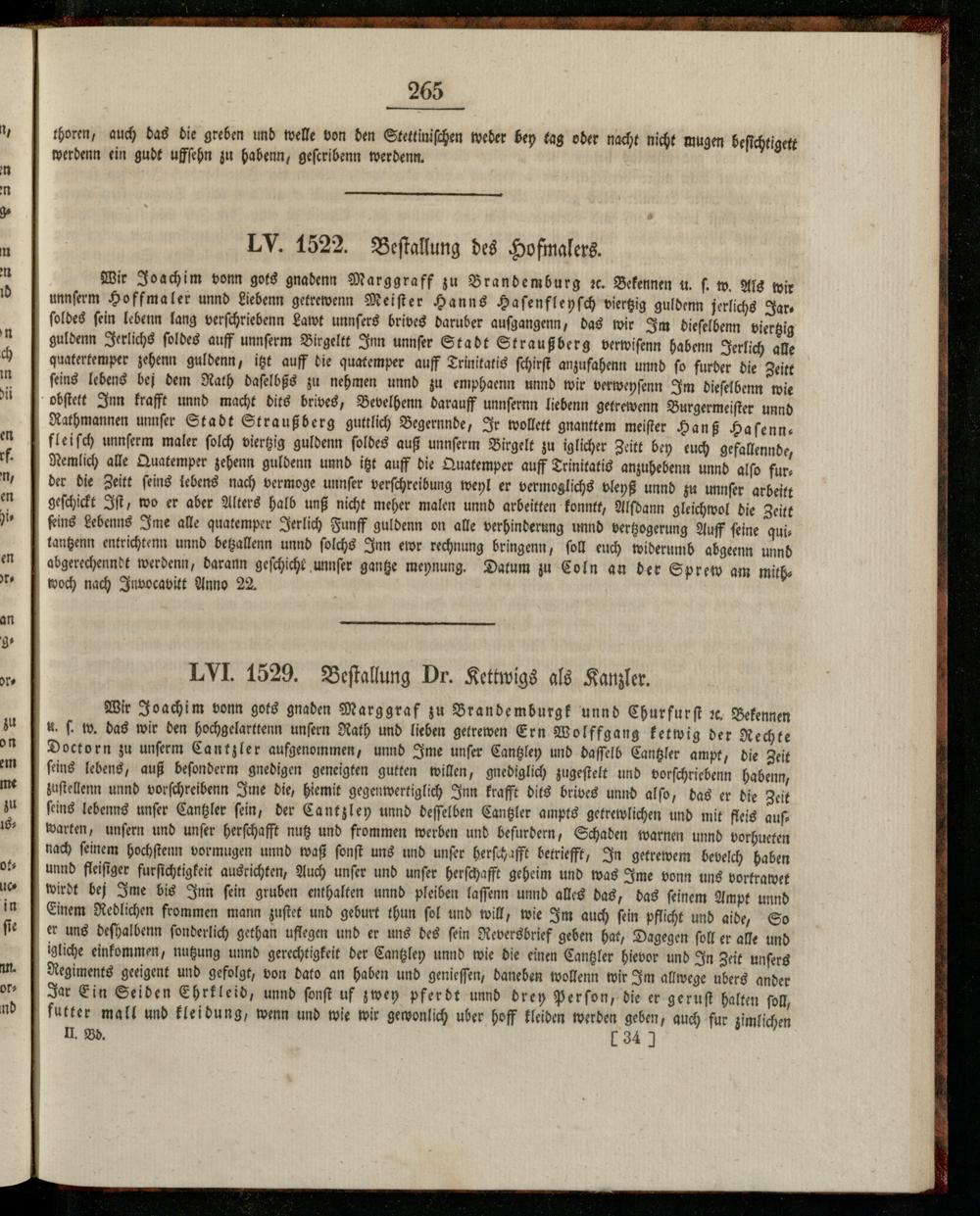 Wir Joachim vonn gots gnaden Marggraf zu Brandemburgk unnd Churfur ſt 2. Bekennen 1. ſ. w. das wir den hochgelarttenn unſern Rath und lieben getrewen Ern Wolffgang ketwig der Rechte Docto rn zu unſerm Cantzler aufgenommen, unnd Ime unſer Cantzley und daſſelb Cantzler ampt, die Zeit ſeins lebens, auß beſonderm gnedigen geneigten gutten willen, gnediglich zugeſtelt und vorſchriebenn habenn, zuſtellenw unnd vorſchreibenn Ime die, hiemit gegenwertiglich Inn krafft dits brives unnd alſo, das er die Zeit ſeins lebens unſer Cantzler fein, der Cantzley unnd deſſelben Cantzler ampts getrewlichen und mit fleis aufs warten, unſern und unſer herſchafft nutz und frommen werben und befurdern, Schaden warnen unnd vorhueten nach ſeinem hochſtenn vormugen unnd waß ſonſt uns und unſer herſchafft betriefft, In getrewem bevelch haben unnd fleiſiger furſichtigkeit ausrichten, Auch unſer und unſer herſchafft geheim und was Ime vonn uns vortrawet wirdt bej Ime bis Inn ſein gruben enthalten unnd pleiben laſſenn unnd alles das, das ſeinem Ampt unnd Einem Reblichen frommen mann zuſtet und geburt thun ſol und will, wie Im auch ſein pflicht und aide, So er uns deſhalbenn ſonderlich gethan uflegen und er uns des fein Reversbrief geben hat, Dagegen ſoll er alle und agliche einkommen, nutzung unnd gerechtigkeit der Cantzley unnd wie die einen Cantzler hievor und In Zeit unſers Regiments geeigent und gefolgt, von dato an haben und genieſſen, daneben wollenn wir Im allwege ubers ander Jar Ein Seiden Ehrkleid, unnd ſonſt uf zwey pferdt unnd drey Per ſon, die er geruſt halten fol, futter mall und kleidung, wenn und wie wir gewonlich uber hoff kleiden werden geben, auch fur zimlichen II. Bd.[34]