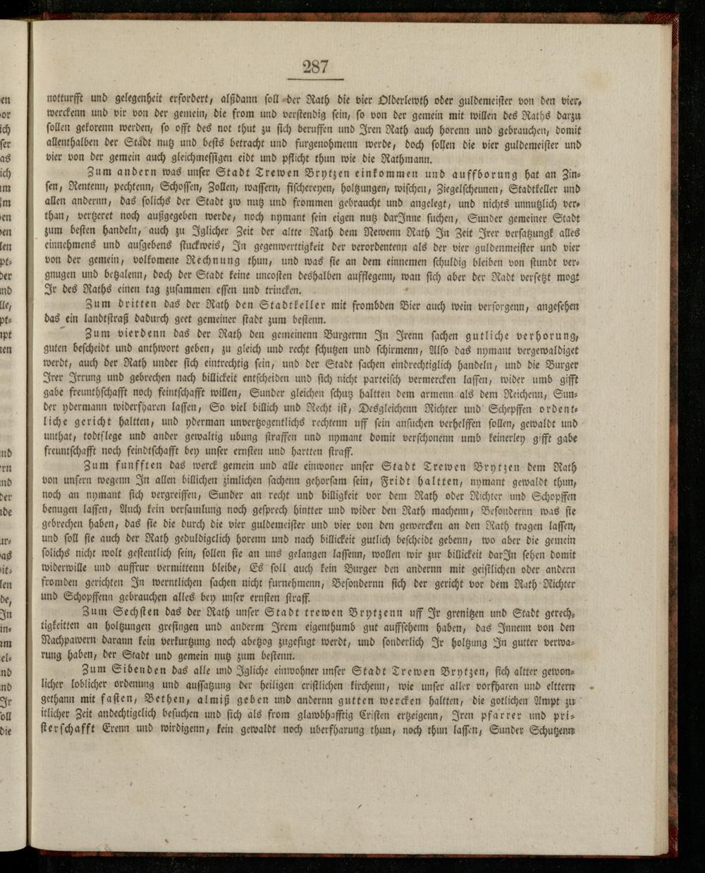 Zum funfften das werck gemein und alle einwoner unſer Stadt Trewen Brytzen dem Rath von unſern wegenn In allen billichen zimlichen ſachenn gehorſam fein, Fridt haltten, nymant gewaldt thun, noch an nymant ſich vergreiffen, Sunder an recht und billigkeit vor dem Rath oder Richter und Schopffen benugen laſſen, Auch kein verſamlung noch geſprech hintter und wider den Rath machenn, Beſondernn was ſie gebrechen haben, das ſie die durch die vier guldemeiſter und vier von den gewercken an den Rath tragen laſſen, und ſoll fie auch der Rath geduldigclich horenn und nach billickeit gutlich beſcheidt gebenn, wo aber die gemein ſolichs nicht wolt geſtentlich fein, ſollen ſie an uns gelangen laſſenn, wollen wir zur billickeit dar In ſehen domit widerwille und auffrur vermittenn bleibe, Es ſoll auch kein Burger den andernn mit geiſtlichen oder andern fromden gerichten In werntlichen ſachen nicht furnehmenn, Beſondernn ſich der gericht vor dem Rath Nichter und Schopffenn gebrauchen alles bey unſer ernſten ſtraff.