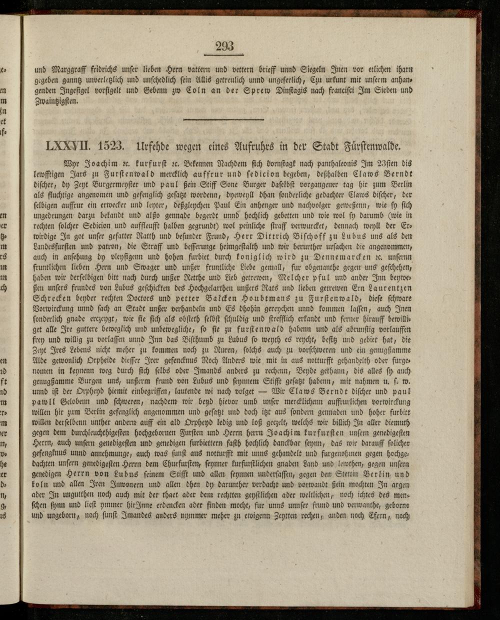 Wyr Joachim ze. kurfurſt ꝛc. Bekennen Nachdem ſich dornſtagk nach panthaleonis Im 23ſten dis lewfftigen Jars zu Furſtenwald mercklich auffrur und ſedicion begeben, deßhalben Claws Berndt diſcher, dy Zeyt Burgermeyſter und paul fein Stiff Sone Burger daſelbſt vorgangener tag hir zum Berlin als fluchtige angenomen und gefenglich geſatzt wordenn, dyeweyll dhan ſonderliche gedachter Claws diſcher, der ſelbigen auffrur ein erwecker und leyter, deßgleychen Paul Ein anhenger und nachvolger geweßenn, wie ſy ſich ungedrungen darzu bekandt und alßo gennade begerdt unnd hochlich gebetten und wie wol ſy darumb(wie in rechten ſolcher Sedicion und auffleufft halben gegrundt) wol peinliche ſtraff verwurcket, dennach weyll der Erwirdige In got unſer gefatter Ratth und beſunder Frund, Herr Dittrich Biſchoff zu Lubus uns als den Landesfurſten und patron, die Straff und beſſerunge heimgeſtalth und wir berurther urſachen die angenommen, auch in anſehung dy vleyſigenn und hohen furbiet durch koniglich wird zu Dennemarcken ze. unſernn fruntlichen lieben Hern und Swager und unßer fruntliche Liebe gemall, fur obgenanthe gegen uns geſchehen, haben wir derſelbigen bitt nach durch unßer Retthe und Lieb getrewen, Melcher pful und ander Inn beyweßen unſers frundes von Lubus geſchickten des Hochgelarthen unßers Rats und lieben getrewen Ern Laurentzen Schrecken beyder rechten Doctors und petter Balcken Houbtmans zu Furſtenwald, dieſe ſchware Vorwirckung unnd ſach an Stadt unßer verhandeln und Es dhohin gereychen unnd kommen laſſen, auch Inen ſonderlich gnade erczeygt, wie ſie ſich als obſteth ſelbſt ſchuldig und ſtrefflich erkandt und ferner hirauff bewilliget alle Ire guttere beweglich und unbewegliche, ſo ſie zu furſtenwald habenn und als abrunſtig vorlauffen frey und willig zu vorlaſſen unnd Inn das Biſthumb zu Lubus ſo weyth es reycht, beſitz und gebiet hat, die Zeyt Ires Lebens nicht meher zu kommen noch zu Ruren, ſolchs auch zu vorſchweren und ein genugßamme Alde gewonlich Orpheide dieſſer Irer gefencknus Noch Anders wie mit in aus notturfft gehandelth oder furgenomen in keynenn weg durch ſich ſelbs oder Imands anders zu rechenn, Beyde gethann, dis alles ſy auch genugßamme Burgen uns, unßerm frund von Lubus und ſeynnem Stifft geſatzt habenn, mit nahmen u. ſ. w. unnd iſt der Orpheyd hiemit einbegriffen, lautende wi nach volget— Wir Elaws Berndt diſcher und paul pawll Gelobenn und ſchweren, nachdem wir beyd hievor umb unſer mercklichenn auffrurlichen vorwirckung willen hir zum Berlin gefenglich angenommen und gefaßt und doch itzt aus ſondern gennaden und hoher furbitt willen derſelbenn unther andern auff ein ald Orpheyd ledig und loß geczelt, welchs wir billich In aller diemuth gegen dem durchleuchthigeſten hochgebornen Furſten und Herrn herrn Joachim kurfurſten unſern genedigeſten Herrn, auch unſern genedigeſten und genedigen furbiettern faſth hochlich danckbar ſeynn, das wir darauff ſolicher gefengknus unnd annehmunge, auch was ſunſt aus notturfft mit unns gehandelt und furgenohmen gegen hochge— dachten unſern genedigeſten Herrn dem Churfurſten, ſeynner kurfurſtlichen gnaden Land und lewthen, gegen unſern genedigen Herrn von Lubus ſeinem Stifft und allen ſeynnen underſaſſen, gegen den Stettin Berlin und koln und allen Iren Inwonern und allen dhen dy darunther verdacht und vorwandt fein mochten In argen ader In ungutthen noch auch mit der thaet ader dem rechtten geyſtlichen ader weltlichen, noch ichtes des mens ſchen ſynn und lieſt ymmer hirInne erdencken ader finden mocht, fur unns unnſer frund und verwanthe, geborne und ungeborn, noch ſunſt Imandes anders nymmer meher zu ewigenn Zeytten rechen, anden noch Efern, noch