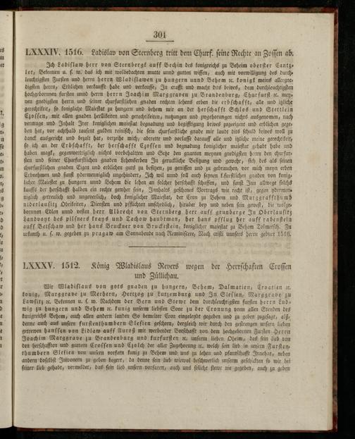 Ich Ladiſlaw herr von Sternbergk auff Bechin des konigreichs zu Beheim oberſter Cantz ler, Bekennen u. ſ. w. das ich mit wolbedachten mutte unnd gutten wiſſen, auch mit vorwilligung des durch— leuchtigſten Furſten und herrn herrn Wladiſlawen zu hungern unnd Behem rc. konigk meins allergnedigſten herrn, Erblichen verkaufft habe und verkeuffe, In crafft und macht dies brives, dem duͤrchleuchtigſten hochgebornnen furſten unnd herrn herrn Joachim Marggraven zu Brandenburg, Chur furſt ꝛc. meynen gnedigſten herrn und ſeiner churfurſtlichen gnaden rechten lehens erben die erbſchafft, alle und itzliche gerechtikeit, ſo konigliche Maieſtat zu hungern und behem mir an der herſchafft Schlos und Stettlein Czoſſen, mit allen gnaden herllikeiten und gerechtikeiten, nutzungen und zwgehorungen nichts ausgenomen, nach vermuge und Inhalt Irer koniglichen maieſtat begnadung und begifftigung brives zugeeigent und erblichen gegeben hat, vor achthalb tauſent gulden reiniſch, die ſein churfurſtliche gnade mir laudt dits ſchuld brives woll zu danck ausgericht und bezalt hat, verzeihe mich, abtrette und vorlaſſe darauff alle und itzliche meine gerechtikeit, ſo ich an der Erbſchafft, der herſchafft Czoſſen und begnadung koniglicher maieſtat gehabt habe und haben magk, gegenwerttiglich nichts vorbehaltten und Setze den gnanten meynen gnedigſten herrn den churfurs ſten und ſeiner Churfurſtlichen gnaden Lehenserben In geruckliche Beſitzung und gewehr, ſich des als ſeinen churfurſtlichen gnaden Eigen und erblichen guts zu beſitzen, zu geniſſen und zu gebrauchen, vor mich meyn erben Erbnehmen und ſunſt ydermenniglich ungehindert, Ich wil unnd ſoll auch ſeynen k. furſtlichen gnaden von koniglicher Maieſtet zu hungern unnd Behem die lehen an ſolcher herſchafft ſchaffen, und ſunſt Inn allwege ſolchs kauffs der herſchafft halben ein rechte gewher fein, Innhalts geſchenes Vortrags wie recht iſt, gegen ydermenniglich getreulich und ungeverlich, doch koniglicher Maieſtat, der Cron zu Behem und Marggraffthumb niderlauſitz Obrikeiten, Dienſten und pfflichten unſchedlich, hiruber bey und neben fein geweſt, die wolgebornnen Edlen unnd veſten herr Albrecht von Sternberg herr auff grunberge In Oberlauſitz Landvoyt des pilſners krays und Tachow haubtman, her hans pfflug her auff rabenſtein auff Betſchaw und her hans Bruckner von Bruckeſtein, koniglicher maieſtat zu Behem Tolmetſch. Zu urkunth u. ſ. w. gegeben zu pragaw am Sonnabende nach Reminiſcere, Nach criſti unnſers herrn geburt 1516.