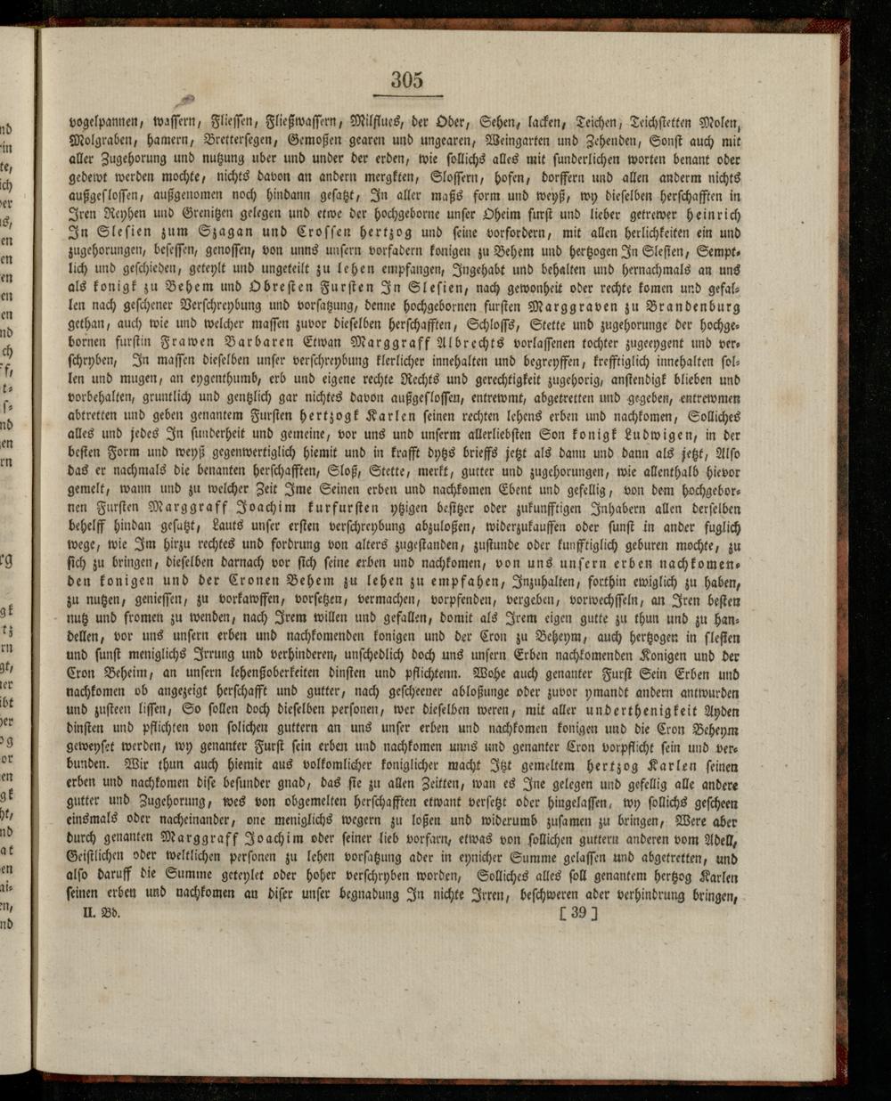 vogelpannen, waſſern, Flieſſen, Fließwaſſern, Milflues, der Oder, Sehen, lacken, Teichen, Teichſtetten Molen, Molgraben, hamern, Bretterſegen, Gemoßen gearen und ungearen, Weingarten und Zehenden, Sonſt auch mit aller Zugehorung und nutzung uber und under der erden, wie ſollichs alles mit ſunderlichen worten benant oder gedewt werden mochte, nichts davon an andern mergkten, Sloſſern, hofen, dorffern und allen anderm nichts außgeſloſſen, außgenomen noch hindann gefaßt, In aller maßs form und weyß, wy dieſelben herſchafften in Iren Reyhen und Grenitzen gelegen und etwe der hochgeborne unſer Oheim ſurſt und lieber getrewer heinrich In Sleſien zum Szagan und Croſſen hertzog und ſeine vorfordern, mit allen herlichkeiten ein und zugehorungen, beſeſſen, genoſſen, von unns unſern vorfadern konigen zu Behem und hertzogen In Sleſien, Semptlich und geſchieden, geteylt und ungeteilt zu Lehen empfangen, Ingehabt und behalten und hernachmals an uns als konigk zu Behem und Obreſten Furſten In Sleſien, nach gewonheit oder rechte komen und gefal— len nach geſchener Verſchreybung und vorſatzung, denne hochgebornen furſten Marggraven zu Brandenburg gethan, auch wie und welcher maſſen zuvor dieſelben herſchafften, Schloſſs, Stette und zugehorunge der hochgebornen furſtin Frawen Barbaren Etwan Marggraff Albrechts vorlaſſenen tochter zugeeygent und vers ſchryben, In maſſen dieſelben unſer verſchreybung klerlicher innehalten und begreyffen, krefftiglich innehalten fol len und mugen, an eygenthumb, erb und eigene rechte Rechts und gerechtigkeit zugehorig, anſtendigk blieben und vorbehalten, gruntlich und gentzlich gar nichtes davon außgeſloſſen, entrewmt, abgetretten und gegeben, entrewmen abtretten und geben genantem Furſten hertzogk Karlen ſeinen rechten lehens erben und nachkomen, Solliches alles und jedes In ſunderheit und gemeine, vor uns und unſerm allerliebſten Son konigk Ludwigen, in der beſten Form und weyß gegenwertiglich hiemit und in krafft dytzs brieffs jetzt als dann und dann als jetzt, Alſo das er nachmals die benanten herſchafften, Sloß, Stette, merkt, gutter und zugehorungen, wie allenthalb hievor gemelt, wann und zu welcher Zeit Ime Seinen erben und nachkomen Ebent und gefellig, von dem hochgebor— nen Furſten Marggraff Joachim kurfurſten ytzigen beſitzer oder zukunfftigen Inhabern allen derſelben behelff hindan geſatzt, Lauts unſer erſten verſchreybung abzuloßen, widerzukauffen oder ſunſt in ander fuglich wege, wie Im hirzu rechtes und fordrung von alters zugeſtanden, zuſtunde oder kunfftiglich geburen mochte, zu ſich zu bringen, dieſelben darnach vor ſich feine erben und nachkomen, von uns unſern erben nachkomenden konigen und der Cronen Behem zu lehen zu empfahen, Inzuhalten, forthin ewiglich zu haben, zu nutzen, genieſſen, zu vorkawffen, vorſetzen, vermachen, vorpfenden, vergeben, vorwechſſeln, an Iren beſten nutz und fromen zu wenden, nach Irem willen und gefallen, domit als Irem eigen gutte zu thun und zu handellen, vor uns unſern erben und nachkomenden konigen und der Cron zu Beheym, auch hertzogen in ſleſien und ſunſt meniglichs Irrung und verhinderen, unſchedlich doch uns unſern Erben nachkomenden Konigen und der Cron Beheim, an unſern lehenßoberkeiten dinſten und pflichtenn. Wohe auch genanter Furſt Sein Erben und nachkomen ob angezeigt herſchafft und gutter, nach geſcheener abloßunge oder zuvor ymandt andern antwurden und zuſteen liſſen, So ſollen doch dieſelben perſonen, wer dieſelben weren, mit aller underthenigkeit Ayden binſten und pflichten von ſolichen guttern an uns unſer erben und nachkomen konigen und die Cron Beheym geweyſet werden, wy genanter Furſt fein erben und nachkomen unns und genanter Cron vorpflicht fein und ver= bunden. Wir thun auch hiemit aus volkomlicher koniglicher macht Itzt gemeltem hertzog Karlen ſeinen erben und nachkomen diſe beſunder gnad, das ſie zu allen Zeitten, wan es Ine gelegen und gefellig alle andere gutter und Zugehorung, wes von obgemelten herſchafften etwant verſetzt oder hingelaſſen, wy ſollichs geſcheen einsmals oder nacheinander, one meniglichs wegern zu loßen und widerumb zuſamen zu bringen, Were aber durch genanten Marggraff Joachim oder feiner lieb vorfarn, etwas von ſollichen guttern anderen vom Adel, Geiſtlichen oder weltlichen perſonen zu lehen vorſatzung ader in eynicher Summe gelaſſen und abgetretten, und alſo daruff die Summe geteylet oder hoher verſchryben worden, Solliches alles ſoll genantem hertzog Karlen feinen erben und nachkomen an diſer unſer begnadung In nichte Irren, beſchweren ader verhindrung bringen, II. Bd. 139]