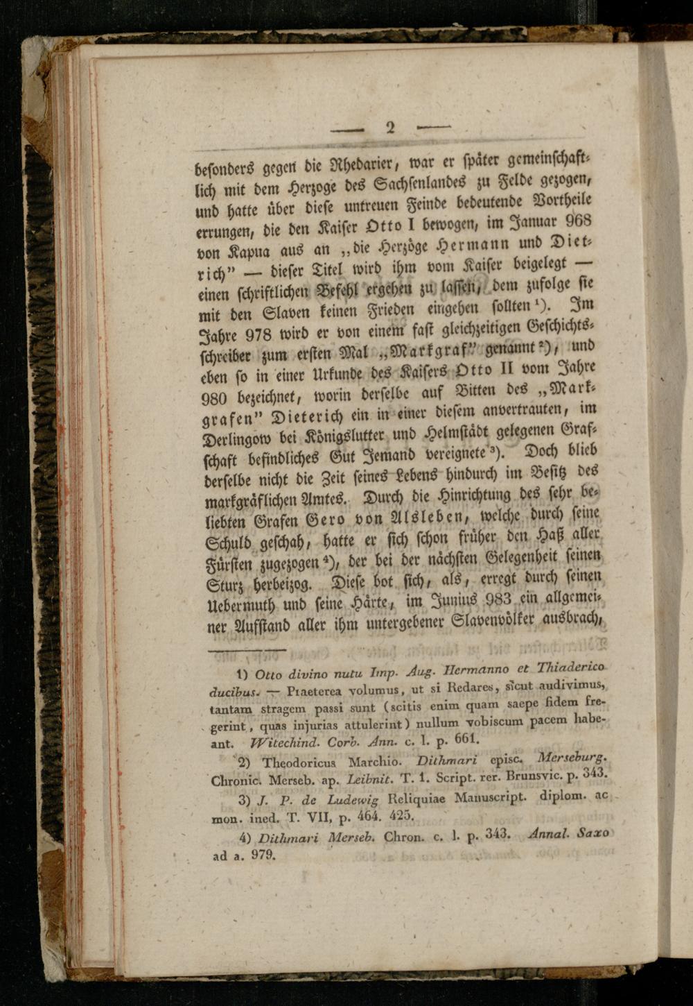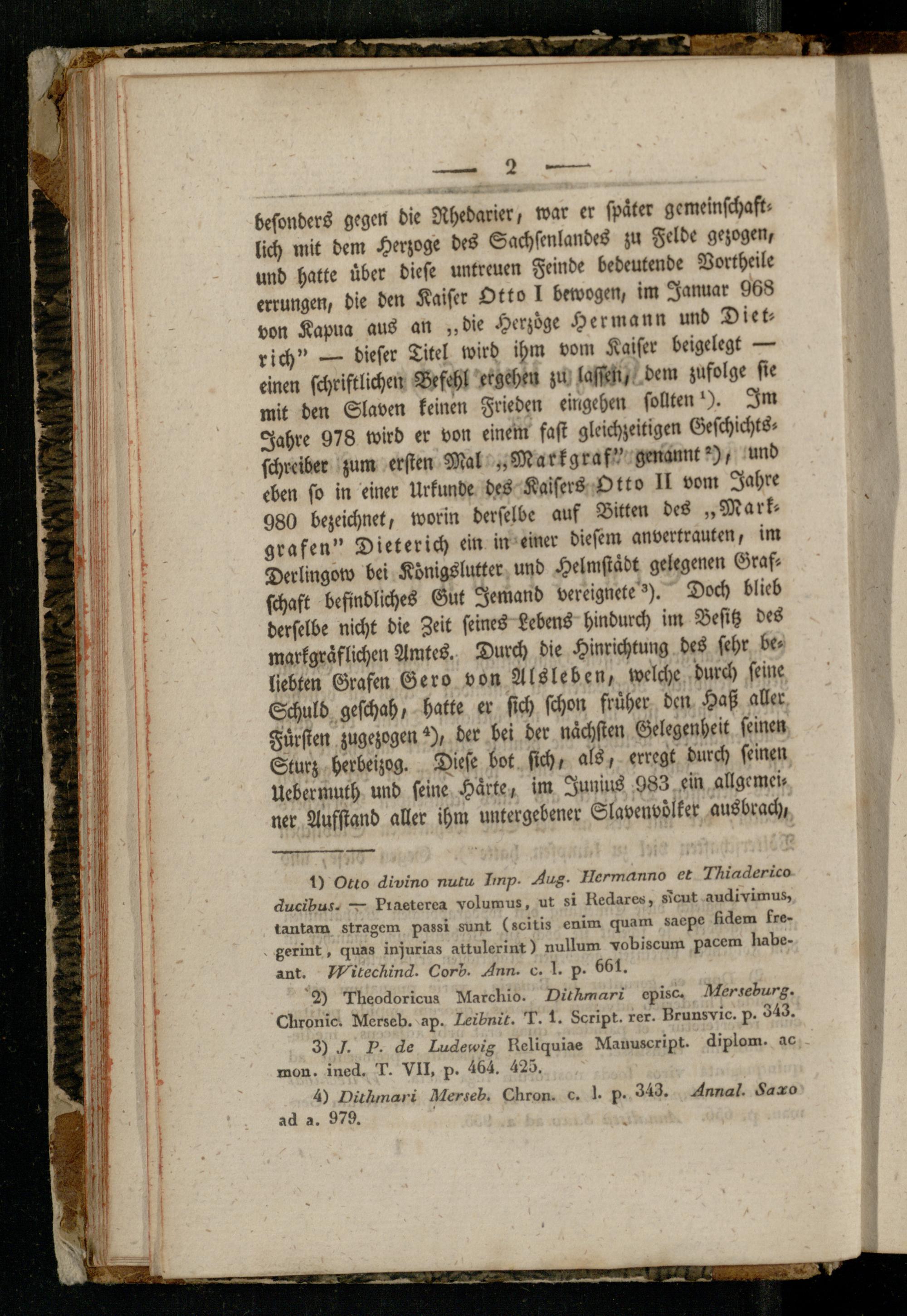 besonders gegen die Rhebarier, war er später gemeinschaftlich mit dem Herzoge des Sachsenlandes zn Felde gezogen, und hatte über diese untreuen Feinde bedeutende Vorthrile errungen, die den Kaiser Otto I bewogen, im Januar 968 von Kapua aus an „die Herzoge Hermann und Dietrich" — dieser Titel wird ihm vom Kaiser beigelegt — einen schriftlichen Befehl ergehen zu lasset,, dem zufolge sie mit den Slaven keinen Frieden eingehen sollten1). Im Jahre 978 wird er von einem fast gleichzeitigen Geschichtsschreiber zum ersten Mal „Markgraf" genannt2), und eben so in einer Urkunde des Kaisers Otto II vom Jahre 980 bezeichnet, worin derselbe auf Bitten des „Markgrafen" Dieterich ein in einer diesem anvertrauten, im Derlingow bei Königslutter und Helmstädt gelegenen Grafschaft befindliches Gut Jemand vereignete3). Doch blieb derselbe nicht die Zeit seines Lebens hindurch im Besitz des markgräflichen Amtes. Durch die Hinrichtung des sehr be. liebten Grafen e Gero von Alsleben , welche durch sein Schuld geschah, hatte er sich schon früher den Haß aller Fürsten zugezogen 4), der bei der nächsten Gelegenheit seinen Sturz herbeizog. Diese bot sich, als, erregt durch seinen Uebermuth und seine Härte, im Junius 983 ein allgemeiner Aufstand aller ihm untergebener Slavenvölker ausbrach,