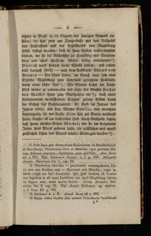 letztere in Masse in die Gegend der heutigen Altmark ein- fielen, die hier zwar am Tangerflusse mit des Bischofes von Halberstadt und des Erzbisthofes von Magdeburg Hülfe besiegt wurden, doch in ihren Landen unüberwunden blieben, wo sie die Bischofsitze zu Havelberg und Brandenburg und alles christliche Wesen völlig vernichteten'). Dietrich ward hierauf feiner Würde entsetzt, und endete bald darnach (984) — nach dem Ausdrucke Adams von Bremen — sein böses Leben, im Genuß einer ihm vom Erzstifte Magdeburg zum Unterhalt gereichten Präbende, durch einen bösen Tod2). Die Slaven suchte der Kaiser selbst wieder zu unterwerfen und setzte den Grafen Lothar von Walbek ihnen zum Markgrafen ein ; doch unter fortdauernden verwüstenden Kriegen gelang diesem kaum der Schutz des Sachsenlandes. Er starb im Januar des Jahres 1003, und seine Wittwe Godila, eine vornehme Lothringerin, die der Kaiser Otto ihm zur Gattin verschafft hatte, brachte es am kaiserlichen Hofe durch Geschenke dahin, daß ihrem ältesten Sohne Werner, den fie im dreizehnten Jahre ihres Alters geboren hatte, die gräflichen und mark- gräflichen Lehen des Vaters wieder übertragen wurden 4).