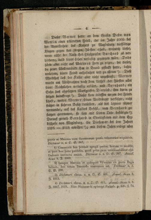 Dieser Werner hatte an dem Grafen Dedo von Wettin einen erbitterten Feind, der im Jahre 1009 bei der Anwesenheit des Kaisers zu Magdeburg vielfältige Klagen gegen den jungen Fürsten erhob, wodurch dieser, wenn nicht der Rath des Pfalzgrafen Burchard es verhinderte, bald seiner Lehen verlustig gegangen wäre. Dedo hörte aber nicht auf Werners Zorn zu reizen, der diesen/ da jener Wollmerstädt ihm in Brand gesteckt hatte, dahin verleitete, seinen Feind aufzusuchen und zu tödte1). Diese Mordthat ließ der Kaiser aber nicht ungestraft; Werner wurde um Weihnachten nach dem Urtheil der Fürsten aller seiner Reichslehen verlustig erklärt, und Bernhard, ein Sohn des abgesetzten Markgrafen Dietrich, ihm darin zu folgen beauftragt 2). Dieser kam indessen wegen der Feind, schaft, womit Werner seinen Verdränger verfolgte, nicht früher in sicheren Besitz derselben, als dis letzterer schwer verwundet, auf des Kaisers Befehl, vom Bernhard ge. fangen genommen, sie ihm mit seinem Tode bestätigtes Darauf gerieth Bernhard in Streitigkeiten mit dem Erzbischöfe von Magdeburg, die Dithmar bei den Jahren 1016 — 1018 erwähnt 4); mit diesem Jahre endigt aber