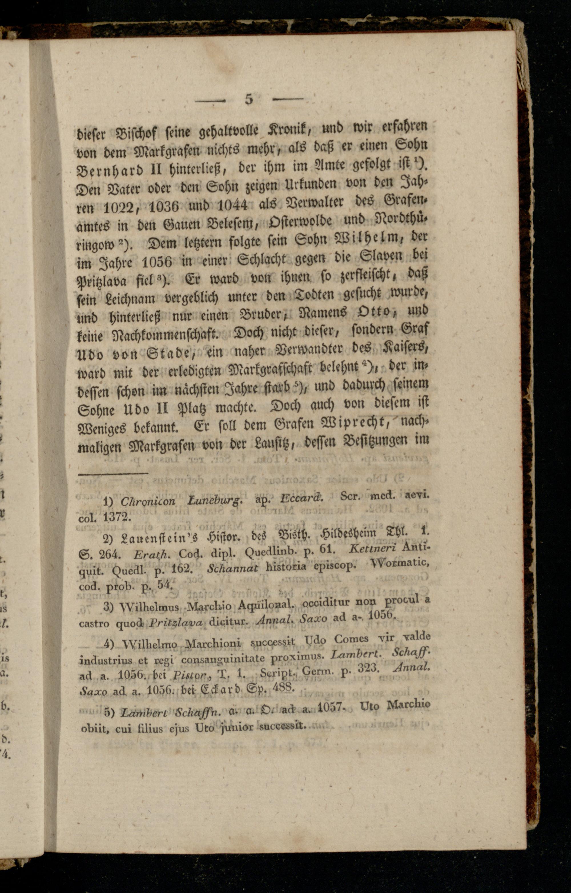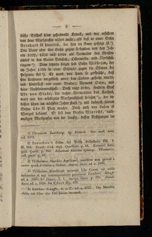 dieser Bischof seine gehaltvolle Kronik, und wir erfahren von dem Markgrafen nichts mehr, als daß er einen Sohn Bernhard II hintcrließ, der ihm im Amte gefolgt ist*). Den Vater oder den Sohn zeigen Urkunden von den Jahren 1022, 1036 und 1044 als Verwalter des Grafen, amtes in den Gauen Belesem, Osterwolde und Nordthü- ringow2). Dem letztem folgte fein Sohn W ilhelm, der im Jahre 1056 in einer Schlacht gegen die Slaven bei Pritzlava fiel 3). Er ward von ihnen so zerfleischt, daß sein Leichnam vergeblich unter den Tobten gesucht wurde, und hinterließ nur einen Bruder, Namens Otto, und keine Nachkommenschaft. Doch nicht dieser, sondern Graf Udo von Stade, ein naher Verwandter des Kaisers, ward mit der erledigten Markgrafschaft belehnt ^), der in- dessen schon im nächsten Jahre starb ^), und dadurch seinem Sohne Udo II Platz machte. Doch auch von diesem ist Weniges bekannt. Er soll dem Grafen Wiprecht, nachmaligen Markgrafen von der Lausitz, dessen Besitzungen im