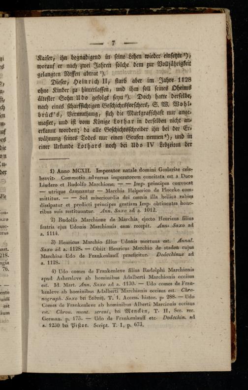 Dieser, Heinrich II, starb aber im Jahre 1128 ohne Kinder zu hinterlassen, und ihm soll seines Oheims ältester Sohn Udo gefolgt seyn ^). Doch hatte derselbe, nach eines scharfsichtigen Geschichtsforschers, S. W. Wohl- brück's, Dermuthung, sich die Markgrafschaft nur ange» maßet, uud ist vom Könige Lothar in derselben nicht an« erkannt worden; da alle Geschichtsschreiber ihn bei der Er» wähnung seines Todes nur einen Grafen nennen*), und in einer Urkunde Lothars noch bei Udo IV Lebzeiten der