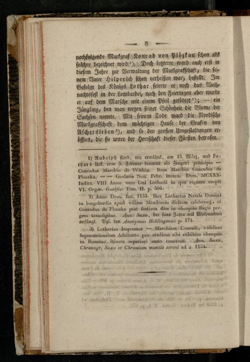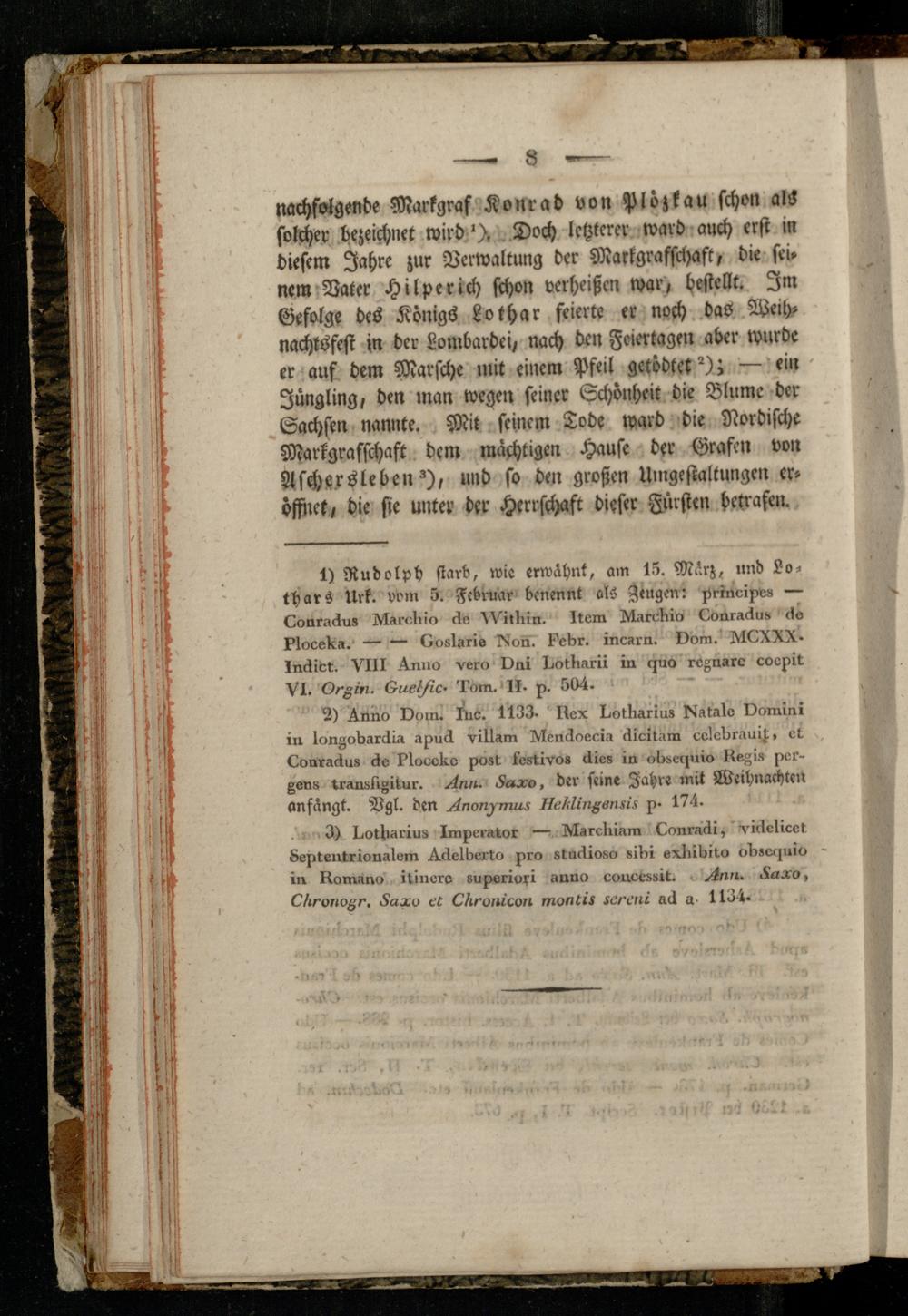 nachfolgende Markgraf Konrad von Plözkau schon als solcher bezeichnet wird '), Doch letzterer ward auch erst in diesem Jahre zur Verwaltung der Markgrafschaft, die sei- nem Vater Hilperich schon verheißen war, bestellt. Im Gefolge des Königs Lothar feierte er noch das Weihnachtsfest in der Lombardei, nach den Feiertagen aber wurde er auf dem Marsche mit einem Pfeil gelobtet *); — rin Jüngling, den man wegen seiner Schönheit die Blume der Sachsen nannte. Mit seinem Tode ward die Nordische Markgrafschaft dem mächtigen Hause der Grafen von Aschersl eben ^ ), und so den großen Umgestaltungen er- öffnet, die sie unter der Herrschaft dieser Fürsten betrafen.