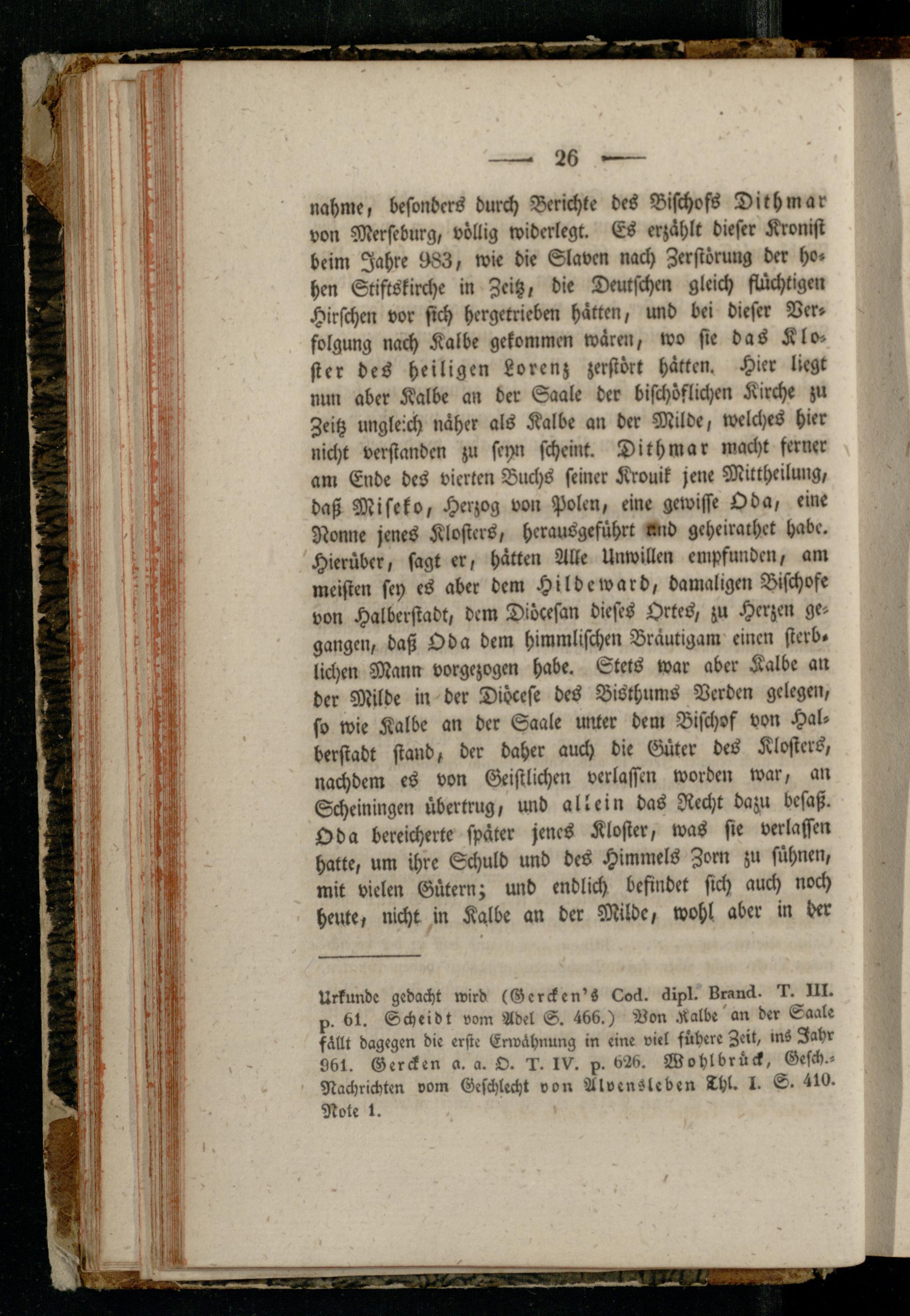 nahme, besonders durch Berichte des Bischofs Dithmar von Merseburg, völlig widerlegt. Es erzählt dieser Kronist beim Jahre 983, wie die Slavrn nach Zerstörung der ho. hen Stiftskirche in Zeitz, die Deutschen gleich flüchtigen Hirschen vor sich Hergetrieben hätten, und bei dieser Der» folgung nach Kalbe gekommm wären, wo sie das Kloster des heiligen Lorenz zerstört hätten. Hier liegt nun aber Kalbe an der Saale der bischöflichen Kirche zu Zeitz ungleich näher als Kalbe an der Milde, welches hier nicht verstanden zu sryn scheint. Dithmar macht ferner am Ende des vierten Buchs seiner Kronik jene Mittheilung, daß Miseko, Herzog von Polen, eine gewisse Oda, eine Nonne jenes Klosters, herausgeführt und geheirathet habe.