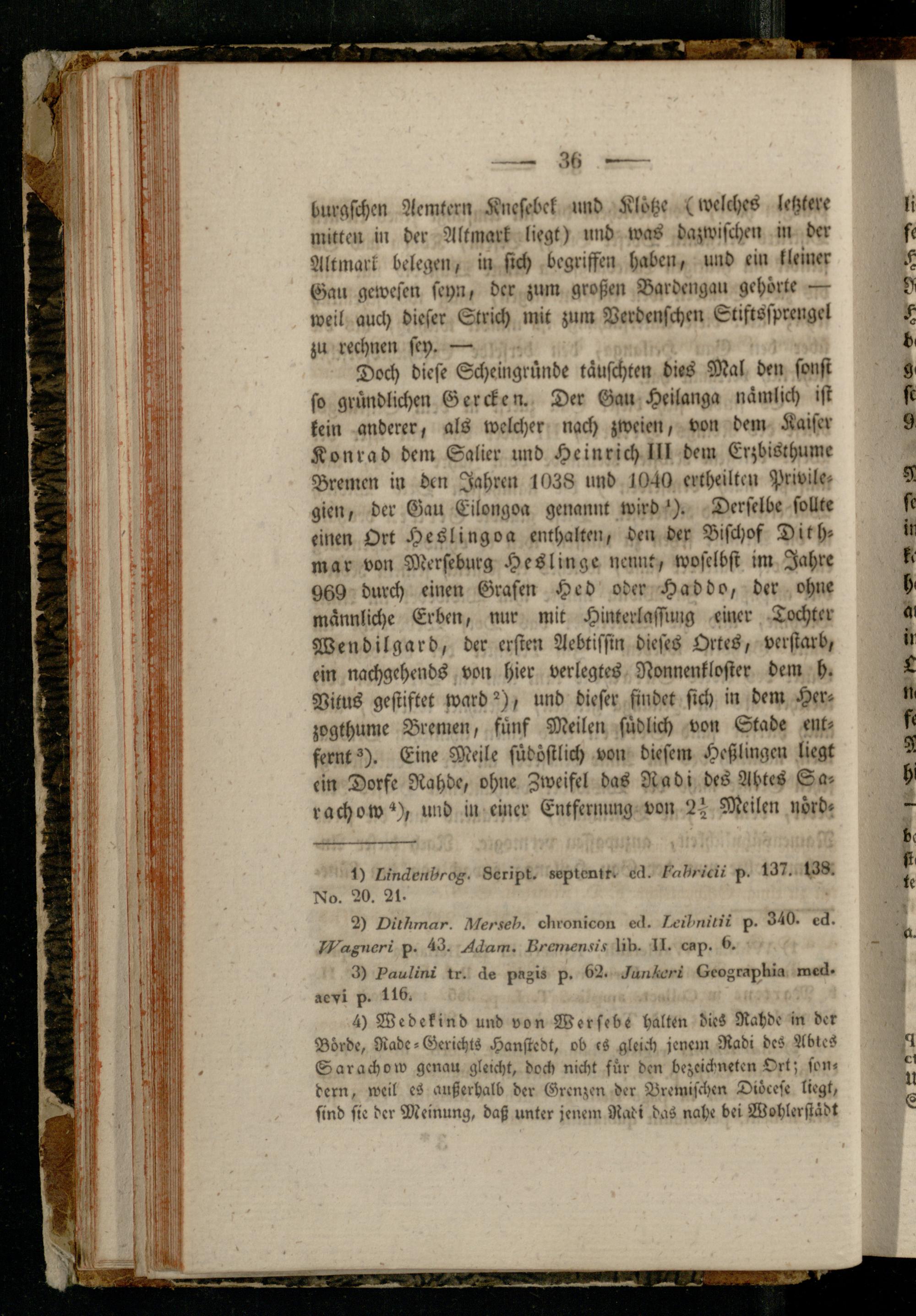 Doch diese Scheingründe täuschten dies Mal den sonst so gründlichen Gercken. Der Gau Heilanga nämlich ist kein anderer, als welcher nach zweien, von dem Kaiser Konrade dem Salier und Heinrich II l dem Erzbisthum Bremen in den Jahren 1038 und 1040 ertheilten Privilegien, der Gau Eilongoa genannt wird'). Derselbe sollte einen Ort Heslingoa enthalten, den der Bischof Dith- mar von Merseburg Heslinge nennt, woselbst im Jahre 969 durch einen Grasen Hed oder Haddo, der ohne männliche Erben, nur mit Hinterlassung einer Tochter Wendilgard, der ersten Aebtissin dieses Ortes, verstarb, ein nachgehends von hier verlegtes Nonnenkloster dem h. Vitus gestiftet ward^), und dieser findet sich in dem Her- zogthume Bremen, fünf Meilen südlich von Stade entfernt^). Eine Meile südöstlich von diesem Heßlingen liegt ein Dorfe Rahde, ohne Zweifel das Radi des Abtes Sa- rachow 4)- , und in einer Entfernung von 2^ Meilen nörd