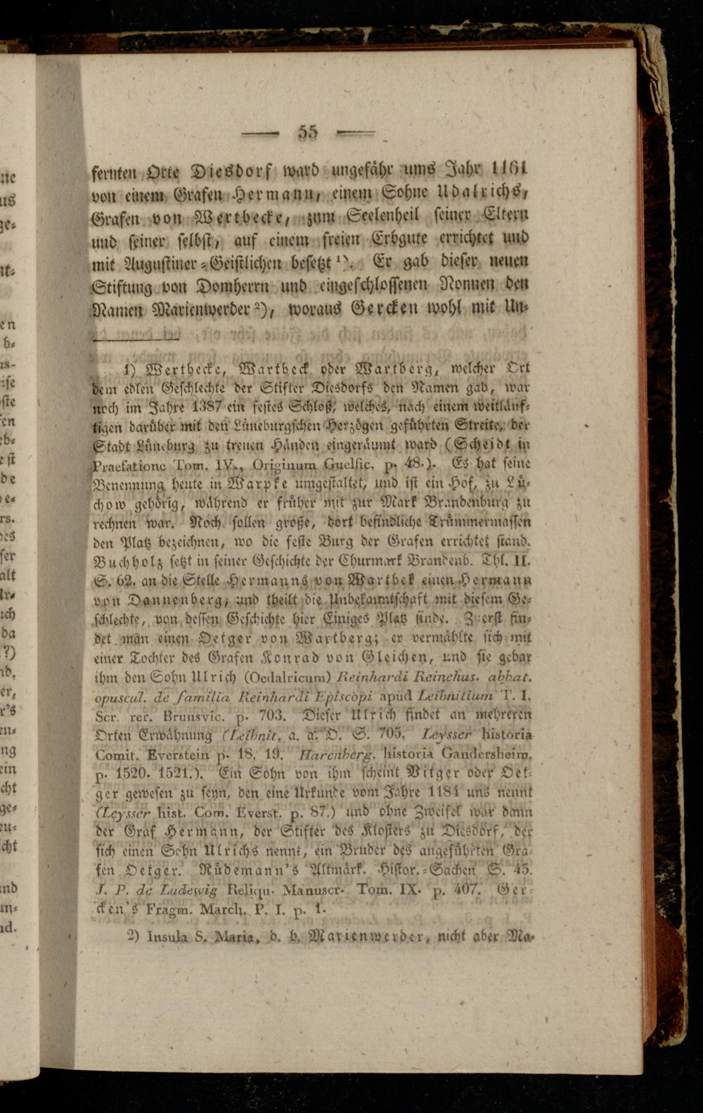 feinte» Orte Diesdorf ward ungefähr ums Jahr ll6l von einem Grafen Hermann, einem Sohne Udairichs, Grafen von Wertbecke, zum Seelenheil seiner Eltern und seiner selbst, auf einem freien Erbgute errichtet und mit Augustiner »Geistlichen besetzt". Er gab dieser neuen Stiftung von Domherrn und eingeschlossenen Nonnen den .Namen Maricnwerder H, woraus Gercken wohl mit Um