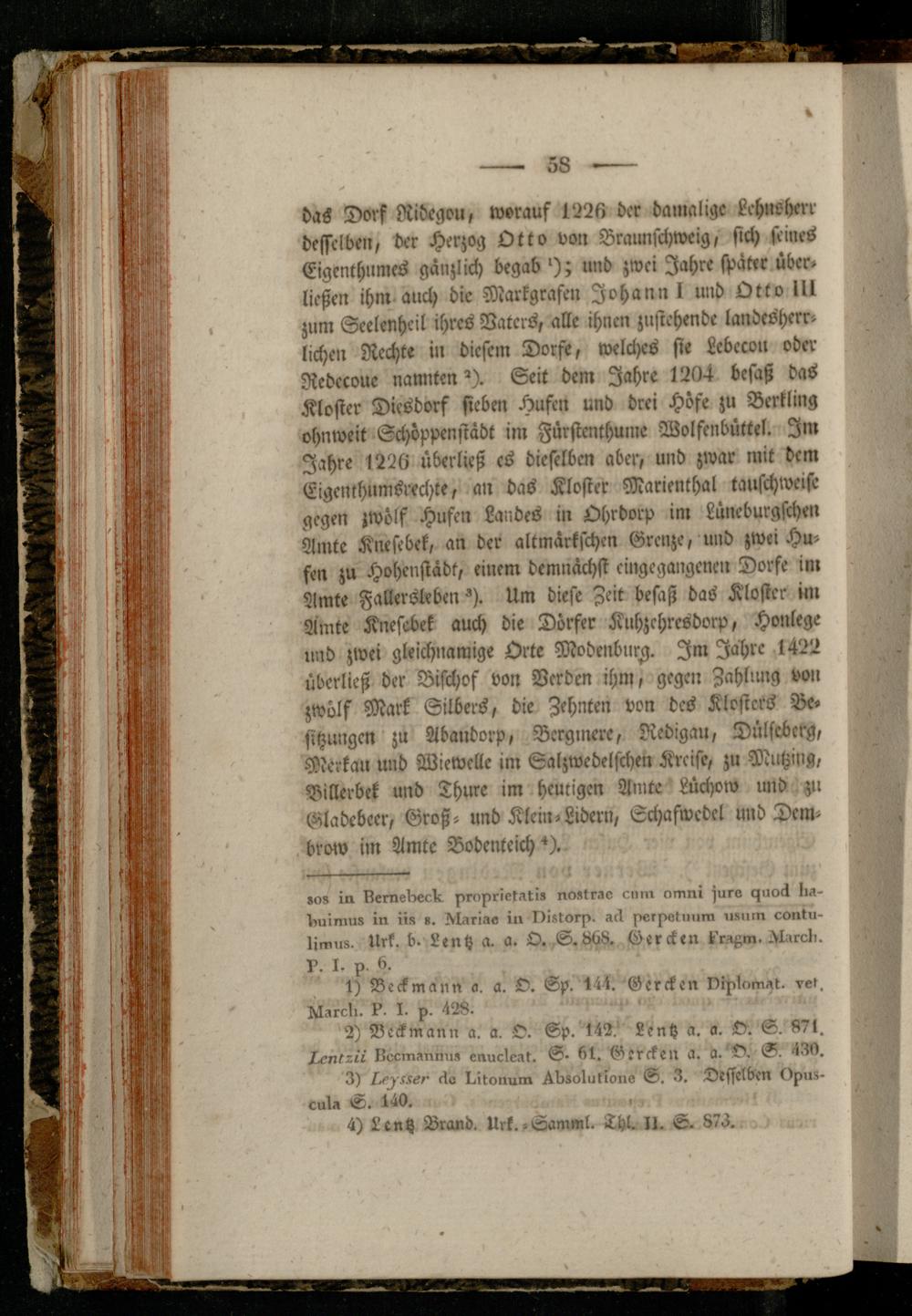 das Dorf Ridcgou, worauf 1226 der damaligc Lehnsherr desselben, der Herzog Otto von Braunschweig, sich seines Eigenthnmes gänzlich begab I; und zwei Jahre später über» ließen ihm auch die Markgrafen Johann I und Otto lll zum Seelenheil ihres Vaters, alle ihnen zustehende landesherrlichen Rechte in dicscin Dorfe, welci-es sie Lebccou oder Redccoue nannten'). Seit dem Jahre 1204 besaß das Kloster Diesdorf sieben Hufen und drei Höfe zu Bertling ohnweit Schöppenstädt im Fürstenthume Wolfenbüttel. Im Jahre 1226 überließ cs dieselben aber, und zwar mit dem Eigenthumsrechte, an das Kloster Marienthal tauschweise gegen zwölf Hufen Landes in Ohrborp im Lüneburgschen Amte Knesebek, an der altmärkschen Grenze, und zwei Hufen zu Hohenstädt, einem demnächst cingegangenen Dorfe im Amte FallerslebenUm diese Zeit befaß das Kloster im Amte Knesebek auch die Dörfer Kuhzehresdorp, Honlege und zwei gleichnamige Orte Modenburg. Im Jahre l422 überließ der Bischof von Verden ihm, gegen Zahlung von zwölf Mark Silbers, die Zehnten von des Klosters Be» sitzungcn zu Abandorp, Bcrginere, Redigau, Dülseberg, Merkau und Wiewelle im Sakzwedelschen Kreise, zu Mutzing, Billerbek und Thure im heutigen Amte Lüchow und, zu Gladcbeer, Groß- und Klein-Lidern, Schafwcbel und Dem- brow im Amte Bodenteich ^).
