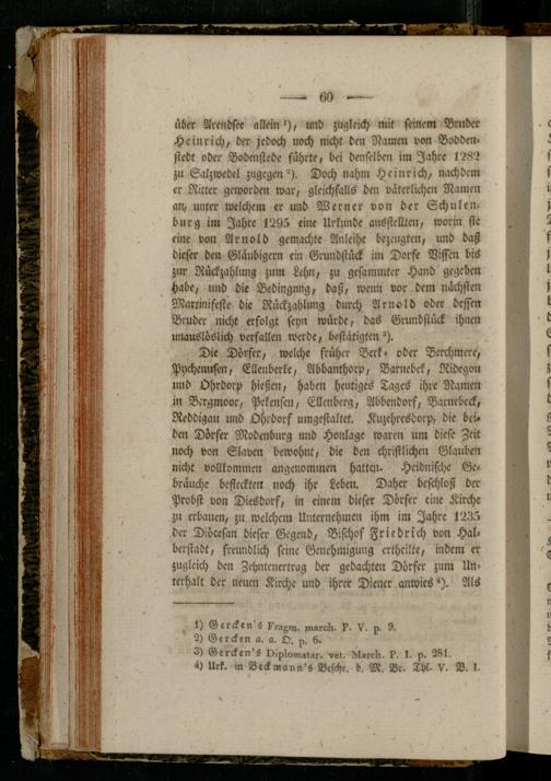 Die Dörfer, welche früher Berk» oder Berchmere, Pychenusen, Ellenberke, Abbanthorp, Barnebek, Ridegou und Ohrdorp hießen, haben heutiges Tages ihre Namen in Dergmoor, Pekensen, Ellcnberg, Abbendorf, Barnebeck, Reddigau und Ohrdorf umgestaltet. Kuzchresdorp, die beiden Dörfer Modenburg und Honlage waren um diese Zeit noch von Slaven bewohnt, die den christlichen Glauben nicht vollkommen angenommen hatten- Heidnische Gebräuche befleckten noch ihr Leben. Daher beschloß der Probst von Diesdorf, in einem dieser Dörfer eine Kirche zu erbauen, zu welchem Unternehmen ihm im Jahre 1235 der Diöcesan dieser Gegend, Bischof Friedrich von Halberstadt, freundlich seine Genehmigung erthcilte, indem er zugleich den Zehntenertrag der gedachte» Dörfer zum Unterhalt der neuen Kirche und ihrer Diener anwies *). Als