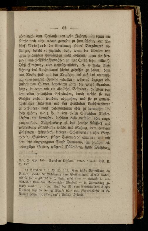 1) Gercken a. a. O. S. 161. Eine solche Vertreibung der Slaven, welche der Bekehrung zum Christcnthume abbold blieben, wie sie hier angedroht wird, scheint nicht selten — vielleicht bei mitwirkenden Gründen ökonomischer Klugheit — in Anwendung gebracht worden zu seyn. Auch der Abt vom AniMinischcn Kloster Niendorf ließ die strenge Strafe über viele Slawendörfer in Er- füllung gehen. Beckmann's Anhalt. Historie.