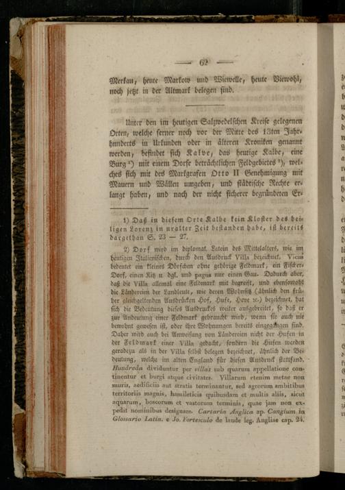 Unter den im heutigen Salzwedelschen Kreise gelegenen Orten, welche ferner noch vor der Mitte des 13tcn Jahrhunderts in Urkunden oder in älteren Kronikcn genannt werden, befindet sich Kalve, das heutige Kalbe, eine Burg mit einem Dorfe beträchtlichen Fcldgcbictes'), wel. ches sich mit des Markgrafen Otto II Genehmigung mit Mauern und Wallen umgebm, und städtische Rechte er. langt habm, und nach der nicht sicherer begründeten Er-
