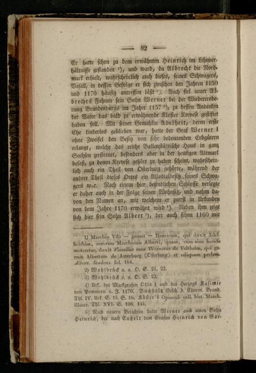 Er hatte schon zu dem erwähnten Heinrich im Lchnvcr« hältnisse gestanden '), und ward, da Nlbrecht die Nord« mark erhielt, wahrscheinlich auch dieses, seines Schwagers, Vasall, in dessen Gefolge er sich zwischen dm Jahren 1l5» und 1170 häufig antreffcn läßt °). Auch fiel unter Ak- brechts Fahnen sein Sohn Werner bei der Wiedererobe« rung Brandenburgs im Jahre 1157^), ;n dessen Andenken der Vater das bald zu erwähnende Kloster Krevese gestiftet haben soll. Mit seiner Gemahlin Adelheit, deren erste Ehe kinderlos geblieben war, hatte der Graf Werner 1 ohne Zweifel den Besitz von sehr bedeutenden Erbgütern erlangt, welche das reiche Balle» städtische Haus in ganz Sachsen zerstreuet, besonders aber in der heutigen Altmark besaß, zu denen Krevese gehört zu haben scheint, wahrscheinlich auch ein Theil von Osterburg gehörte, während der andere Theil dieses Ortes ein Allodialbcsitz seines Schwa- gcrs w..r. Nach einem hier befindlichen Schlosse verlegte er daher auch in der Folge seinen Wohnsitz, und nahm davon den Namen an, mit welchem er zuerst in Urkunde» von dem Jahre 117» erwähnt wird*). Neben ihm zeigt sich hier sein Sohn Albert ^), der auch schon H160 mit