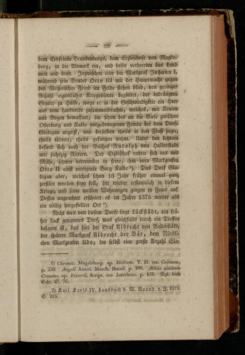 dem Erbfeinde Brandenburgs, dem Erzbischöfe von Magde» bürg, in die Altmark ein, nnd beide verheerten das Land weit und breit. Inzwischen eilte der Markgraf Johann I, während sein Bruder Otto lll mit der Hauptmacht gegen den Meißnischen Feind im Felde stehen blieb, von geringer Anzahl eigentlicher Kriegesleute begleitet, der bedrängten Gegend zu Hülfe, wozu er in der Geschwindigkeit ein Heer ans dem Landvolke zusammenbrachte, welches, mit Keulen und Bogen bewaffnet, die schon bis an die Biese zwischen Osterburg und Kalbe vorgedrungcnen Feinde bei dem Dorfe Gladigau angriff, und dieselben theils in den Fluß jagte, rheils tödtete, theils gefangen nahm. Unter den letztem befand sich auch der Bischof Rudolph von Halberstadt mit sechszig Rittern. Der Erzbischof rettete sich nur mit Mühe, schwer verwundet in seine, ihm vom Markgrafen Otto II einst »ereignete Burg Kalbe I. Das Dorf Gladigau aber, welches schon 16 Jahr früher einmal ganz zerstört worden feyn soll, litt wieder erstaunlich in diesem Kriege, und seine meisten Wohnungen gingen in Feuer auf. Dessen ungeachtet erscheint es im Jahre 1375 wieder als ein völlig hergestellter Ort ^).