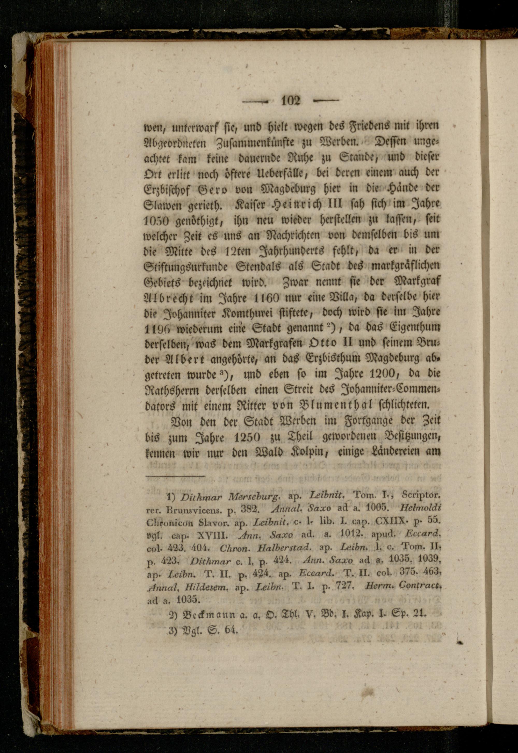wm, unterwarf sie, und hielt wegen des Friedens mit ihren Abgeordneten Zusammenkünfte zu Werben. Dessen ungeachtet kam keine dauernde Rlche zu Stande, und dieser Ort erlitt noch öftere Ueberfalle, bei deren einem auch der Erzbischof Gero von Magdeburg hier in die Hände der Slawen gerieth. Kaiser Heinrich Hl sah sich im Jahre 1050 genöthigt, ihn neu wieder Herstellen zu lassen, seit welcher Zeit cs uns an Nachrichten von demselben bis um die Mitte des 12ten Jahrhunderts fehlt, da er in der Stistungsurkunde Stendals als Stadt des markgräflichcn Gebiets bezeichnet wird. Zwar nennt sie der Markgraf Albrecht im Jahre 1160 nur eine Villa, da derselbe hier die Johanniter Komthurei stiftete, doch wird sie im Jahre 1196 wiederum eine Stadt genannt °), da das Eigenthum derselben, was dem Markgrafen Otto II und seinem Bruder Albert angehörte, an das Erzbisthum Magdeburg ab. getreten wurdet, und eben so im Jahre 1200, da die Rathsherm derselben einen Streit des Johanniter-Commen- dators mit einem Ritter von Blumenthal schlichteten.
