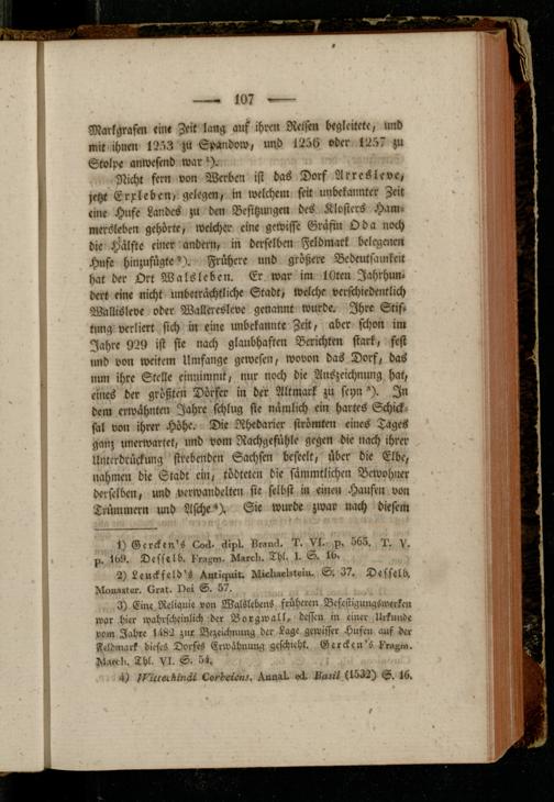Nicht fern von Werben ist bas Dorf Arresleve, jetzt Erpleben, gclegm, in welchem seit unbekannter Zeit eine Hufe Landes zu den Besitzungen des Klosters Hammersieben gehörte, weicher eine gewisse Gräfin Oda noch die Halste einer andern, in derselben Feldmark belegenen Hufe hinzufügte"). Frühere und größere Bedeutsamkeit hat der Ort Wals leben. Er war im lOten Jahrhundert eine nicht unbeträchtliche Stadt, welche verschiedentlich Wallisleve oder Wallereslcve genannt wurde. Ihre Stiftung verliert sich in eine unbekannte Zeit, aber schon im Jahre 929 ist sie nach glaubhaften Berichten stark, fest und von weitem Umfange gewesen, wovon das Dorf, das nun ihre Stelle entnimmt, nur noch die Auszeichnung hat, eines der größten Dörfer in der Altmark zu scyn '). In dem erwähnten Jahre schlug sie nämlich ein hartes Schicksal von ihrer Höhe. Die Rhedarier strömten eines Tages ganz unerwartet, und vom Rachgefühle gegen die nach ihrer Unterdrückung strebenden Sachsen beseelt, über die Elbe, nahmen die Stadt ein, tödtetcn die sämmtli'chen Bewohner derselben, und verwandelten sie selbst in einen Haufen von Trümmern und Asches Sie wurde zwar nach diesem