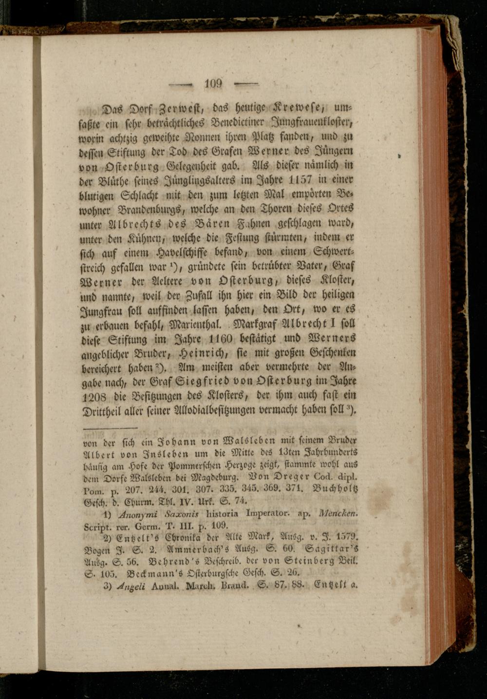 Das Dorf Zerwcst, das heutige Krewese, umfaßte ein sehr beträchtliches Benediktiner Jungfrauenkloster, worin achtzig geweihte Nonnen ihren Platz fanden, und zu dessen Stiftung der Tod des Grafen Werner des Jungem von Osterburg Gelegenheit gab. Als dieser nämlich in der Blüthe seines Jünglingsalters im Jahre 1157 in einer blutigen Schlacht mit den zum letzten Mal empörten Be« wohncr Brandenburgs, welche an den Thoren dieses Ortes unter Albrechts des Bären Fahnen geschlagen ward, unter den Kühnen, welche die Festung stürmten, indem er sich auf einen» Havelschiffe befand, von einem Schwertstreich gefallen war'), gründete sein betrübter Vater, Graf Werner der Ackere von Osterburg, dieses Kloster, und nannte, weil der Zufall ihn hier ein Bild der heiligen Jungfrau soll auffinden lassen haben, den Ort, wo er es zu erbauen befahl, Marienthak. Markgraf Albrecht I soll diese Stiftung im Jahre 1160 bestätigt und Werners angeblicher Bruder, Heinrich, sie mit großen Geschenken bereichert haben -). Am meisten aber vermehrte der Angabe nach, der GrafSiegfried von Osterburg im Jahre 1208 die Besitzungen des Klosters, der ihm auch fast ein Drittheil aller seiner Allodialbesitzungen vermacht haben soll ^).