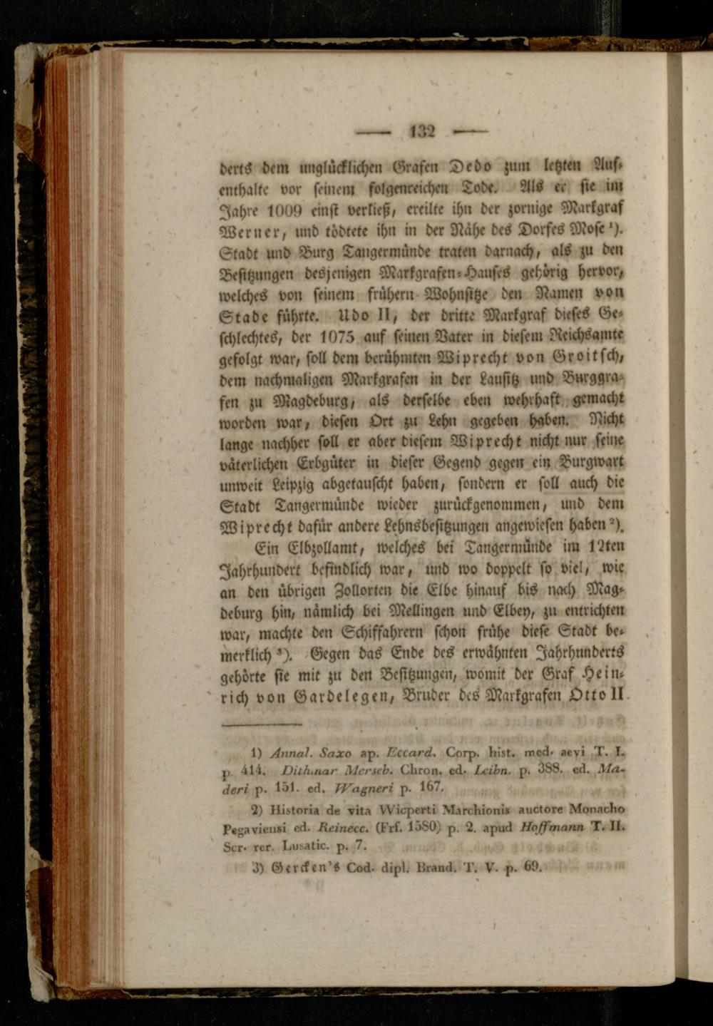 dertö dem unglücklichen Grafen Dedo zum letzten Auf» enthalte vor seinem folgenreichen Tode. Als ee sie un Jahre 1009 einst verließ, ereilte ihn der zornige Markgraf Werner, und tödtete ihn in der Nähe des Dorfes Mose Stadt und Burg Tangermünde traten darnach, als zu den Besitznngen desjenigen Markgrafen»Hanfes gehörig hervor, tvelches von seinem frühem Wohnsitze den Namen von Stade führte. Udo II, der dritte Markgraf dieses Ge» schlechtes, der 1075 auf seinen Vater in diesem Neichsamte gefolgt war, soll dem berühmten Wiprecht von Groitsch, dem nachmaligen Markgrafen in der Lausitz und Burggrafen zu Magdeburg, als derselbe eben wehrhaft gemacht worden war, diesen Ort zu Lehn gegeben haben. Nicht lange nachher soll «r aber diesem Wiprecht nicht nur seine väterlichen Erbgüter in dieser Gegend gegen ein Burgwart unweit Leipzig abgetauscht haben, sondern er soll auch die Stadt Tangermünde wieder zurückgenommen, und dem Wiprecht dafür andere Lehnsbesitzungen angewiesen haben').
