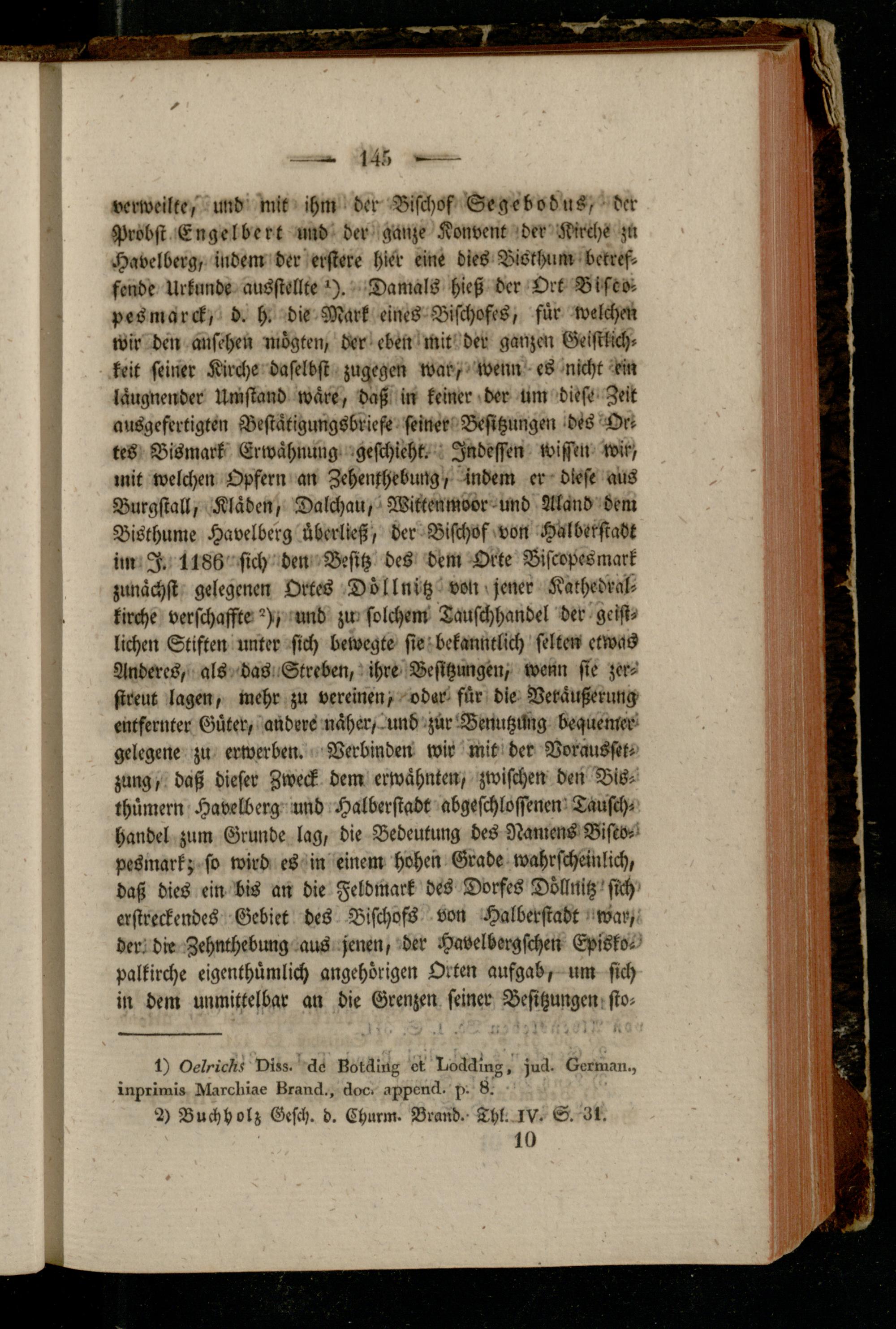 verweilte, und mit ihm der Bischof Segebodus, der Probst Engelbert und der ganze Konvent der Mrche ztt Havelberg, indem der erstere hier eine dies Bisthum betreffende Urkunde ausstellte *). Damals hieß der Ort Bisco-r pesmarck, d. h. die Mark eines Bischofes, für welcher? wir den ansehen inögten, der eben mit der ganzen Geistlichkeit seiner Kirche daselbst zugegen war, wenn es nicht ein läugNender Umstand wäre, daß in keiner der um diese Zeit ausgefertigten Bestatigungsbriefe seiner Besitzungen des Ortes Bismark Erwähnung geschieht. Indessen wissen wir- mit welchen Opfern an ZehenfhebuNg, Indem er diese aus Burgstall, Kläden, Dalchau, Wittenmovr und Aland dem Bisthume Havelberg überließ, der Bischof von Halberstadt in« I. 1186 sich den Besitz des dem Orte Bistopesmark zunächst gelegenen Ortes Döllnitz von jener Kathedral- kirche verschaffte und zw solchem Tauschhandel der geistlichen Stiften unter sich bewegte sie bekanntlich selten etwas Anderes, als das Streben, ihre Besitzungen, wenn sie zerstreut lagen, mehr zu vereinen/ oder für die Veräußerung- entfernter Güter, andere näher,.und zur'Benutzung bequemer gelegene zu erwerben. Verbinden wir mit der Voraussetzung, daß dieser Zweck dem erwähnten, zwischen den Bis- thümern Havelberg und Halberstabt abgeschlossenen Tauschhandel zum Grunde lag, die Bedeutung des Namens Bisco-- pesmark; so wird es in einem hohen Grade wahrscheinlich, daß dies ein bis an die Feldmark des Dorfes Döllnitz'sich' erstreckendes Gebiet des Bischofs von Halberstadt war, der. dir Zehnchebung aus jenen, der Havelbergschen Episko- ' palkirche eigenthümlich angehörigen Orten aufgab, um sich in dem unmittelbar an die Grenzen seiner Besitzungen sto-