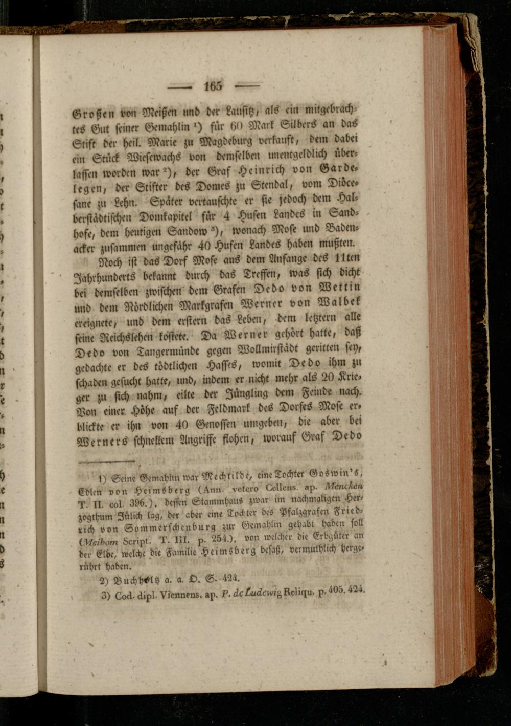 Noch ist das Dorf Mose aus dem Anfänge des Ilten Jahrhunderts bekannt durch das Treffen/ was sich dicht bei demselben zwischen dem Grafen Dedo von Wettin und dem Nördlichen Markgrafen Werner von Walbek ereignete/ und dem erster» das Lebe»/ dem letztem alle seine Reichslehen kostete. Da Werner gehört hakte/ daß Dedo von Tangermünde gegen Wollmirstädt geritten sey/ gedachte er des tödtlichen Hasses/ womit Dedo ihm zu schaden gesucht hatte/ und/ indem er nicht mehr als 20 Krieger zu sich nahm/ eilte der Jüngling dem Feinde nach. Von einer Höhe auf der Feldmark des Dorfes Mose er. blickte er ihn von 40 Genossen umgeben/ die aber bei Werners schnellem Angriffe flohen/ worauf Graf Dedo