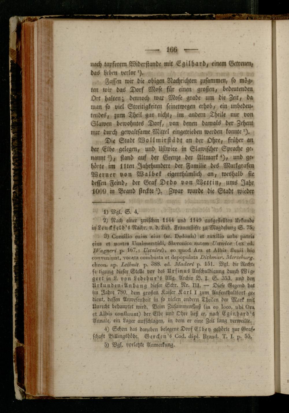 Dis Stadt Woll wirst« dt an der Ohre, früher an der Elbe gelegen, und Usiwice in Slawischer Sprache ge. nannt^), stand auf der Grenze der Altniark *), und ge» hörte im Ilten Jahrhundert der Familie des Markgrafen Werner von Walbek eigenthümlich an, weshalb sie dessen Feind, der Graf Dedo von Wettin, ums Jahr IVOil in Brand siechte *). Zwar wurde die Stadt wieder