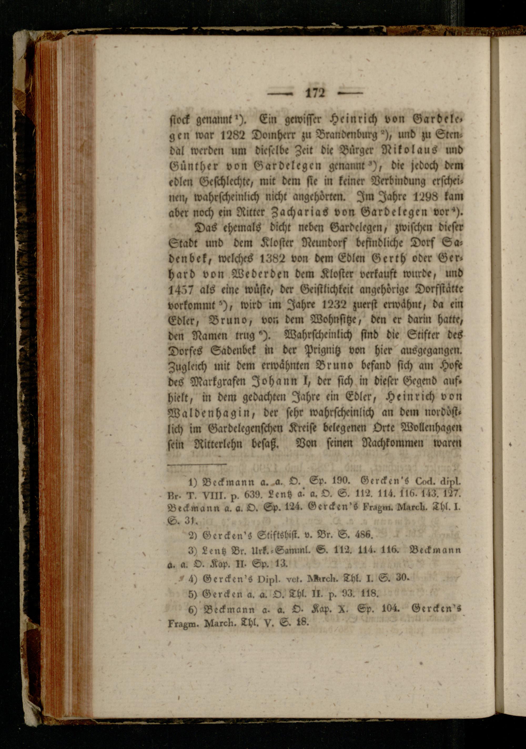 Das ehemals dicht neben Gardelegen, zwischen dieser Stadt und dem Kloster Neundorf befindliche Dorf Ea- denbek, welches 1382 von dem Edlen Verth oder Ger» hard von Wederden dem Kloster verkauft wurde, und 1457 als eine wüste, der Geistlichkeit ungehörige Dorfstätte verkommt'), wird im Jahre 1232 zuerst erwähnt, da ein Edler, Bruno, von dem Wohnsitze, den er darin hatte, den Namen trug"). Wahrscheinlich sind die Stifter des Dorfes Sadenbek in der Prignitz von hier ausgegangcn. Zugleich mit dem erwähnten Bruno befand sich am Hvft des Markgrafen Johann I, der sich in dieser Gegend auf. hielt, in dem gedachten Jahre ein Edler, Heinrich von Waldenhagin, der sehr wahrscheinlich an dem nordöst. lich im Garbelegenschen Kreise belegenen Orte Wollenhagen sein Ritterlehn besaß. Von seinen Nachkommen warm