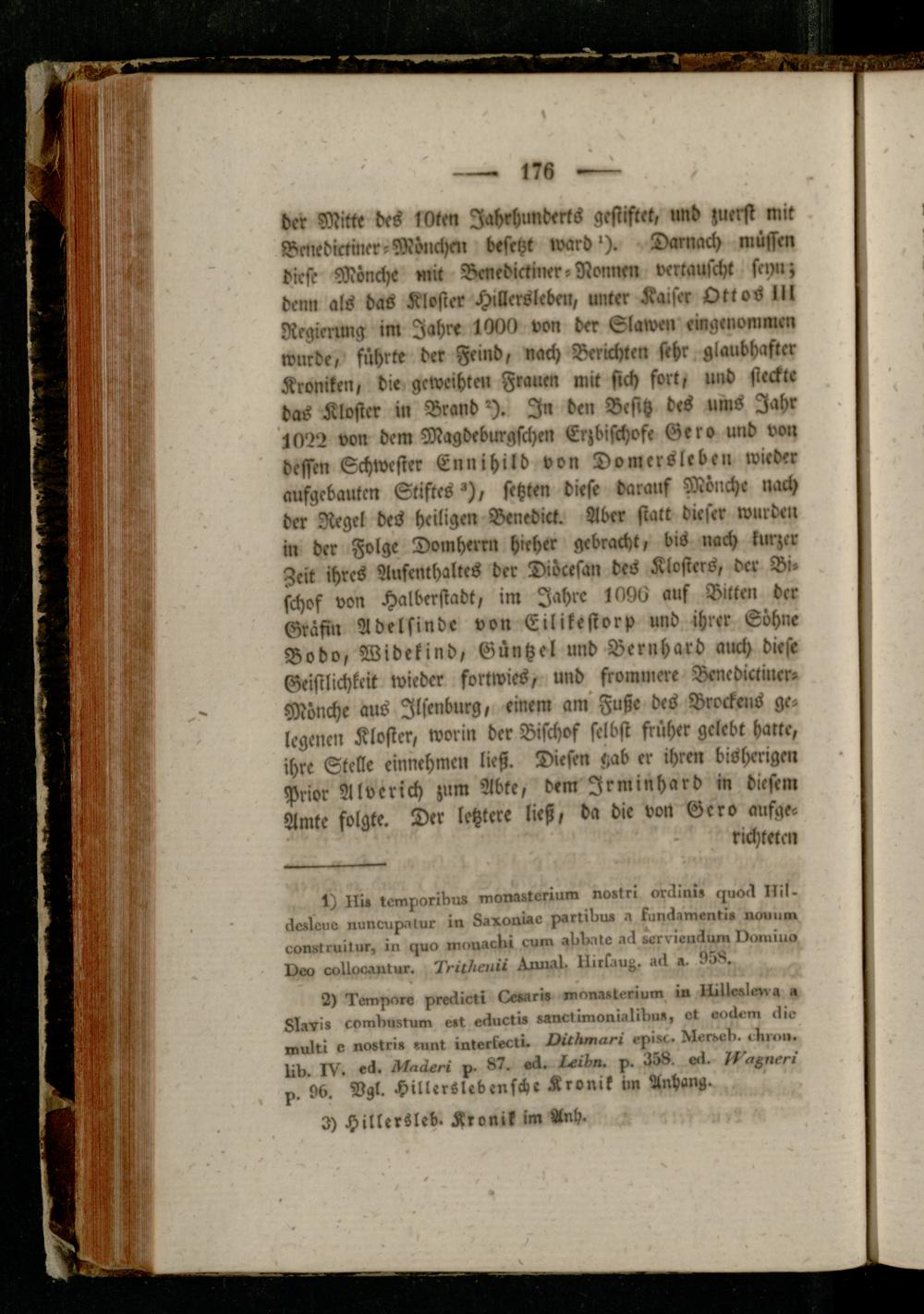 der Mitte des lOten Jahrhunderts gestiftet, und zuerst mit Benediktiner-MöuäM besetzt ivard'). Darnach müssen diese Mönche mit Benediktiner-Nonnen vertauscht sey»; denn als das Kloster Hillcrsleben, unter Kaiser Ottos Ul Regienmg im Jahre 1000 von der Slawen eingenommen wurde, führte der Feind, nach Berichten sehr glaubhafter Kroniken, die geweihten Frauen mit sich fort, und steckte das Kloster in Brand °). In den Besitz des ums Jahr 1022 von dem Magdeburgschen Erzbischöfe Gero und von dessen Schwester Ennihild von Domersleben wieder aufgcbautcn Stiftes *), setzten diese darauf Mönche nach der Regel des heiligen Benedict. Aber statt dieser wurden in der Folge Domherrn hieher gebracht, bis nach kurzer Zeit ihres Aufenthaltes der Diöcesan des Klosters, der Bischof von Halberstadt, im Jahre 1096 auf Bitten der Gräfin Adelsinde von Eilikestorp und ihrer Söhne Bodo, Widekind, Güntzel und Bernhard muH diese Geistlichkeit wieder fortwies, und frommere Benediktiner- Mönche aus Jlsenburg, einem am Fuße des Brockens gelegenen Kloster, worin der Bischof selbst früher gelebt hakte, ihre Stelle einnehmen ließ. Diesen gab er ihren bisherigen Prior Alverich zum Abte, dem Jrminhard in diesem Amte folgte. Der letztere ließ, da die von Gero aufgerichteten