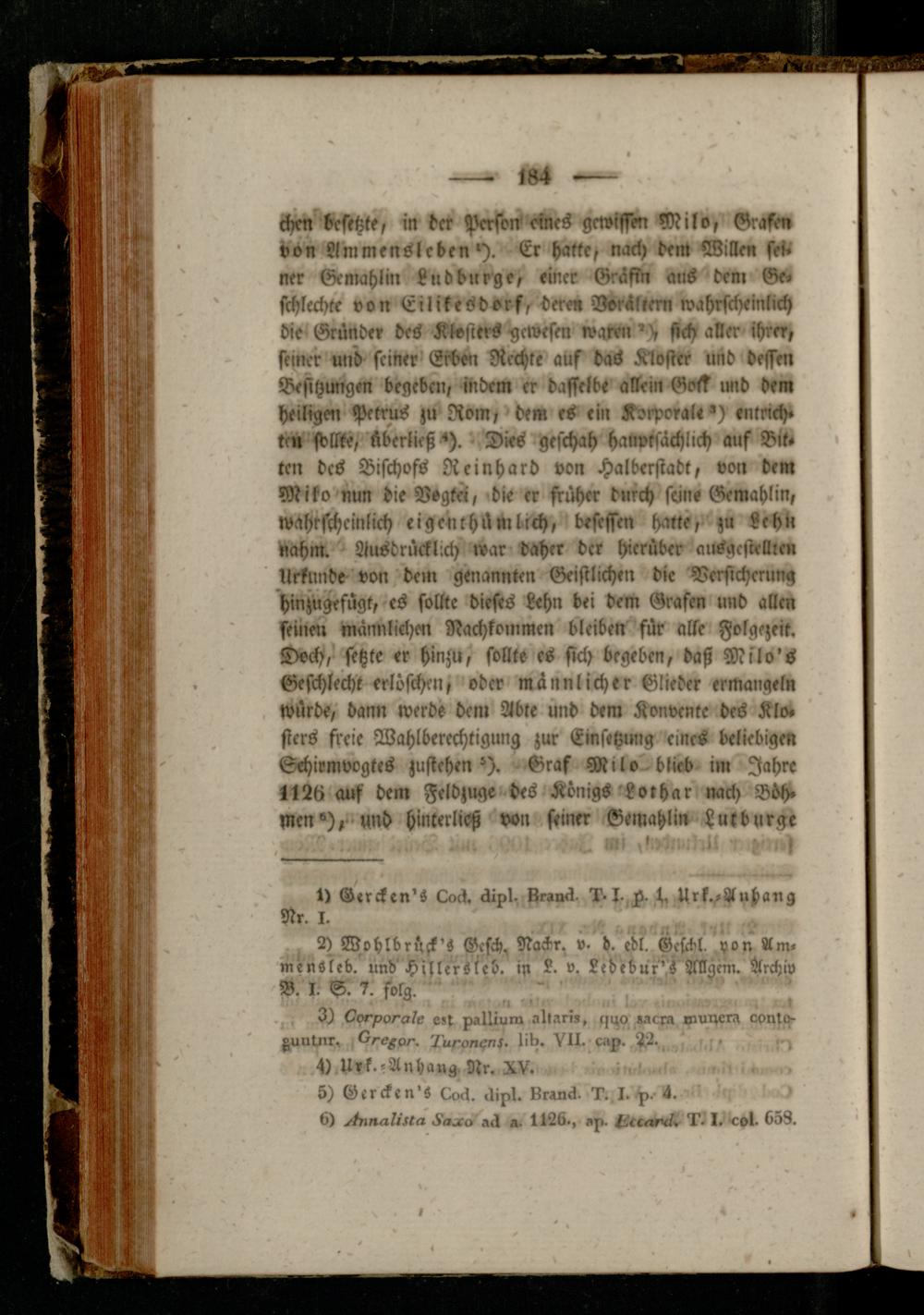 chen besetzte, in der Personales gewissen Milo, Grafen von AmmenslebenEr hatte, nach dem Willen fl ner Gemahlin Lndburge, einer Gräfin ans dem Ge» schlechte von EiIikrsdorf< deren Boräktern wahrscheinlich die Gründer des Klosters-gewesen waren' > sich aller ihrer, seiner und seiner Erden Rechte auf bas Kloster und dessen Besitzungen begeben, indem er dasselbe allein Goss und dem heiligen Petrus zu Rom, dem es rin Korporal«') entlieh, trn fdllke, überließ *). Dies geschah hauptsächlich auf Bit» ten des Bischofs Reinhard von Halberstadt, von dem Miko nun die Vogtei, di« er früher durch sein« Gemahlin, wahrscheinlich eigenthümlach, besessen hatte, zu Lehii nahm. Ausdrücklich war daher der hierüber ausgestellten Urkunde von dem genannten Geistlichen die Versicherung hinzügefügt, es sollte dieses Lehn bei dem Grafen und allen seinen männlichen Nachkommen bleiben für alle Folgezeit. Doch, setzte er hinzu, sollte es sich begeben, daß Milo's Geschlecht erlöschen, oder männlicher Glieder ermangeln würde, dann werde dem Abte und dem Konvente des Klo. sters freie Wahlberechtigung zur Einsetzung eines beliebigen Schirmvogtes zustchen'). Graf Milo blieb im Jahre 1126 auf dem Feldzüge des Königs Lothar nach Böh. men"), und hintrrlioß von feiner Gemahlin Lutburge