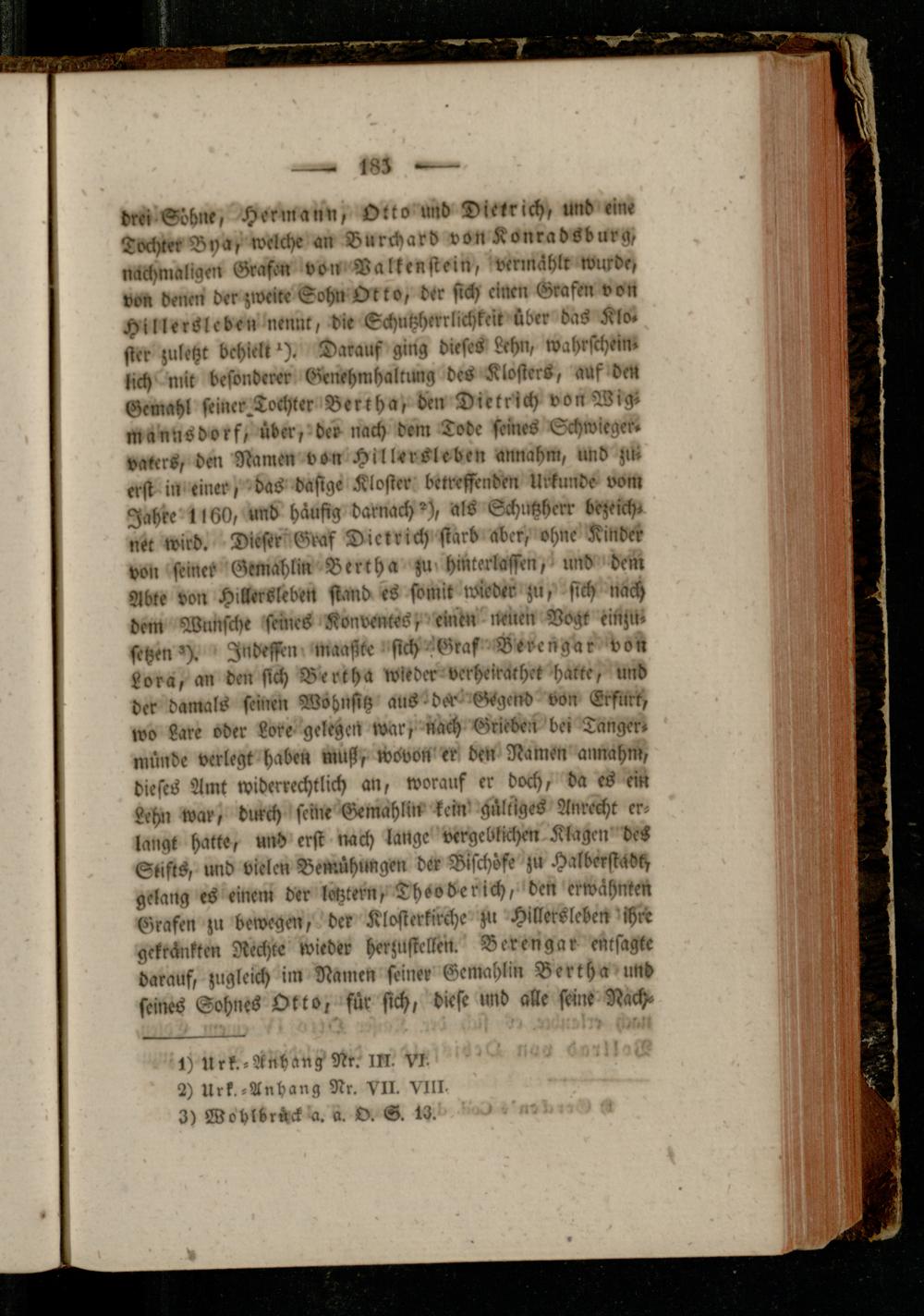 drei Söhne, Hermann, Otto und Dietrich, und ein« Tochter Bya, welche an Burchard von KonradSburg, nachmaligen Grafe« von Valkenstein, vermählt wurde, von denen derziveite Sohn Otto, der sich einen Grafen von Hillersleben nennt, die Schutzherrlichkeit über das Kloster zuletzt behielt Darauf ging dieses Lehn, wahrscheinlich niit besonderer Genehmhalttrng des Klosters, auf den Gemahl seiner.Tochter Bertha, den Dietrich vonWig» mannsdorf, über, der nach dem Tobe seines Schwieger. Vaters, den Namen von Hillersleben annahm, und stierst in einer, das dasige Kloster betreffenden llikunde vom Jahre l 160, und häufig darnach'), als Schntzhcrr bezeichnet wird. Dieser Gt^f Dietrich starb aber, ohne Kinder von feinet Gemahlin Bertha zu'hmterlassen, und dem Abte von Hillersleben stand es somit wieder zu, sich nach dem Wunsche seines Konventes, eint» neuen Vogt eibsti» setzen'). JndeA-i, maasttc sich -Graf Berengar von Lora, an den sich Bertha wieder verheirathet hatte, und der damals seinen Wohnsitz aus-der-Gegend von Erfurt, wo Lare oder Lore gekegen war, nach Grieben bei Tangermünde verlegt haben muß, wövoN er den Namen annahm, dieses Amt widerrechtlich an, worauf er doch, da es ei» Lehn war, durch feine Gemahlin kein' gültiges Anrecht erlangt hatte, und erst nach lange vergeblichen Klagen des Stifts, und vielen Bemühungen der Bischöfe zu Halberstghh gelang es einem der letztem, Theo der ich, den erwähnten Grafen zu bewegen, der Klosterkirche str Hillersleben ihre gekränkten Rechte wieder herstistcllen. Berengar entsagte darauf, zugleich im Namen seiner Gemahlin Bertha und seines Sohnes Otto, für sich, diese und alle seine Nach-
