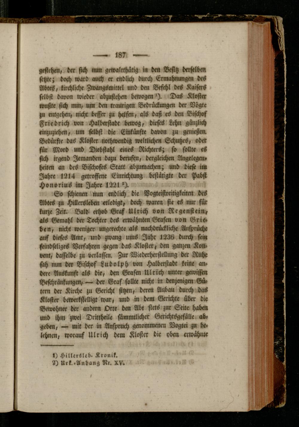 So schienen nun endlich die Vogteistreitigkciten des Abtes zu Hillersleben erledigt, doch waren sie es nur für kurze Zeit. Bald erhob Graf Ulrich von Regenstein, als Gemahl der Tochter des erwähnten Grafen von Grie» den, nicht weniger ungerechte als nachdrückliche Ansprüche auf dieses Amt, und zwang ums Jahr 1236 durch sein feindseliges Verfahren gegen das Kloster, den ganzen Konvent, dasselbe zu verlassen. Zur Wiederherstellung der Ruhe sah nun der Bischof Ludolph von Halberstadt keine andere Auskunft als die, dm Grafen Ulrich unter gewissen Beschränkungen, — der Graf sollte nicht in denjenigen Gütern der Kirche zu Gericht sitzen, bereu Altbau durch das Kloster bewerkstelligt war, und in dem Gerichte über die Bewohner der andern Orte dm Abt stets zur Seite haben und ihm zwei Dritthrile sämmtlicher Gerichtsgefälle abgeben, — mit der in Anspruch genommenen Vogtei zu belehnen, worauf Ulrich hem Kloster die yben erwähme