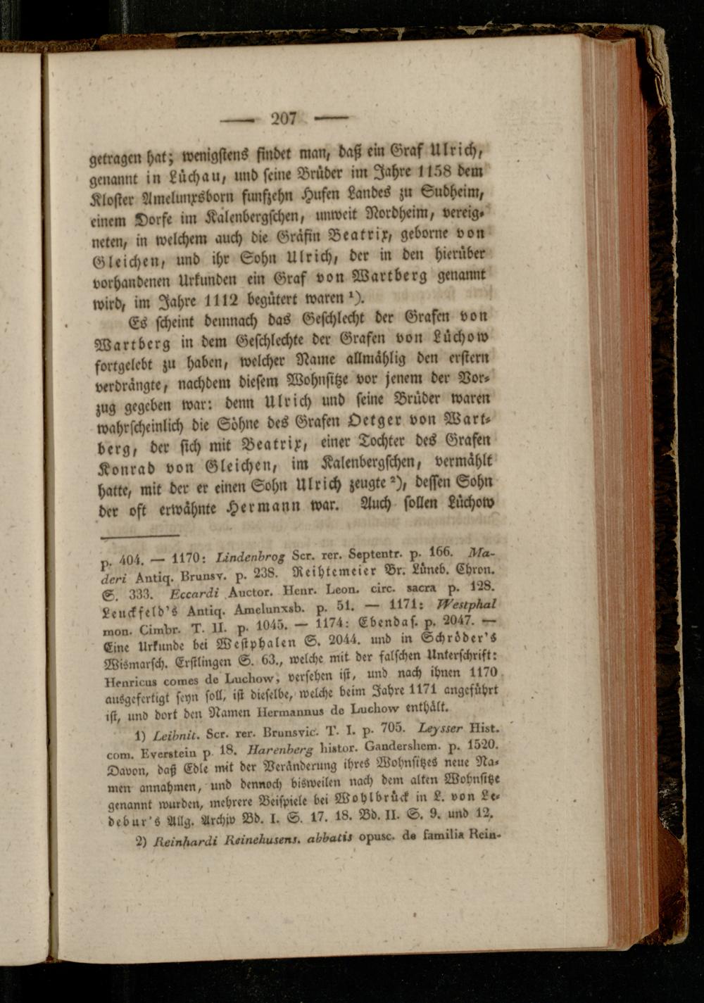 getragen hat; wenigstens findet man, -aß ein Graf Ulrich, genannt in Lüchau, und seine Brüder im Jahre 115,8 dem Kloster Ainelunxsbom fünfzehn Hufen Landes zu Subheim, einem Dorfe im Kalenbergschen, unweit Nvrdheim, vereig. neten, in welchem auch die Gräfin Beatrix, gebome von Gleichen, und ihr Cohn Ulrich, der in den hierüber vorhandenen Urkunden ein Graf von Wartberg genannt wird, im Jahre 1112 begütert waren').