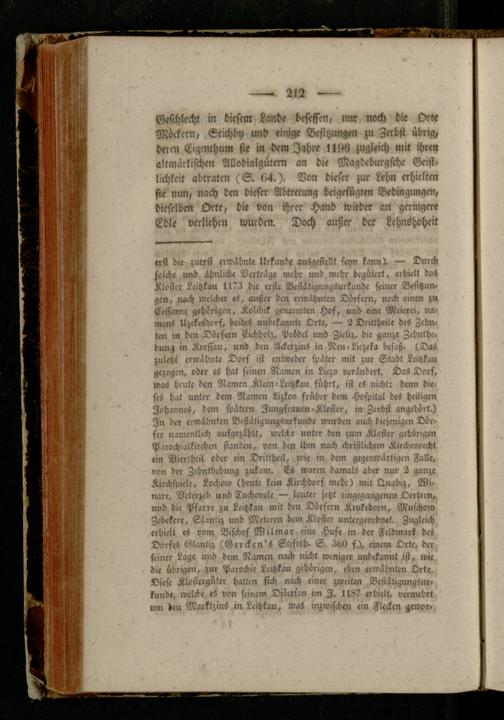 Geschlecht in diesem k.inde besessen, nur noch die Orte Möckern, Etichby und einige Besitzungen zu Zerbst übrig, deren Ligenthum sie in dem Jahre 1198 zugleich mit ihren altmärkischen Modialgütern an di« Äkagdeburgschc Geistlichkeit abtraten (S. t>4.). Von dieser zur kehn erhielten sie nun, nach den dieser Abtretung beigefügten Bedingungen, dieselben Orte, die von ihrer Hand wieder an geringere Edle verliehen wurden. Doch außer der Lchnshvheit
