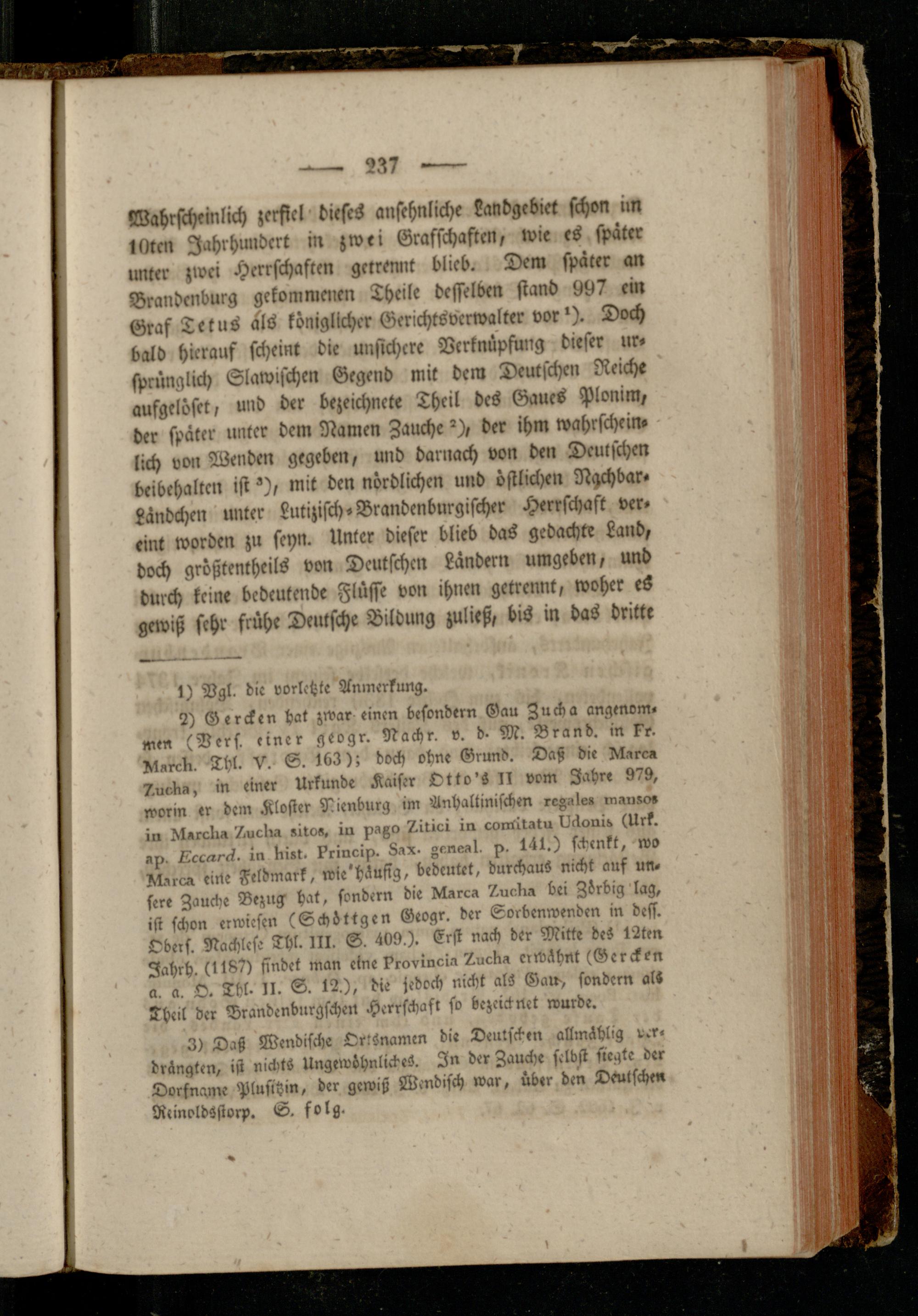 Wahrscheinlich zerfiel dieses ansehnljche Landgebiet schon im lOtcn Jahrhundert in zwei Grafschaften, wie es später unter zwei Herrschaften getrennt blieb. Dem später an Brandenburg gekommenen Theile desselben stand 997 ein Graf Letus als königlicher Gerichtsvcrwalter vor'). Doch bald hierauf scheint die unsichere Verknüpfung dieser ursprünglich Slawischen Gegend mit dem Deutschen Reiche oufgelöset, und der bezeichnet« Thcil des Gaues Plonim, der später unter dem Namen Zauche °), der ihm wahrscheinlich von Wenden gegeben, und darnach von den Deutschen beibehaltcu ist ^), mit den nördlichen und östlicl-en Ngchbar« Ländchen unter Lutizisch-Brandenbnrgischer Herrschaft vereint worden zu seyn. Unter dieser blieb das gedachte Land, doch größtentheils von Deutschen Ländern umgeben, und durch keine bedeutende Flüsse von ihnen getrennt, woher eS gewiß sehr frühe Deutsche Bildung zulirß, bis in das dritte