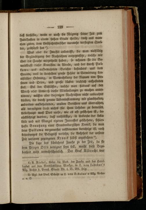 Was aber die Zweifel anbetrifft, die man vielfältig der Beglaubigung der Nachrichten entgegensetzt, welche wir über die Zauche mitgetheilt haben; so nehmen sie die Beweiskraft dieser Kronisten in Abrede, und der durch Pul» kawa uns aufbcwahrten Berichte besonders aus dem Grunde, weil in denselben große Fehler in Verwirrung kro« nistiscl-er Ordnung, in Verwechslung der Namen von Per» sonen und Orken, und große Lücken reichlich aufzufinden sind. Bei den Schlüssen, welche man hieraus auf den Werth oder Unwerth dieser Mittheilungen zu machen unter» nimmt, müssen aber diejenigen Nachrichten nicht unbeachtet bleiben, die durch genaue Uebcreinstimmung mit glaubhaften, anderswo aufbehaltcncn, uralten Berichten uns überraschen, als vermögten diese nichts für ihren Urheber z« beweisen. Uebcrhaupt muß Dies mehr, wie es oft geschehen ist, berücksichtigt werden, daß nachlässige, in Unkunde der Loka» lität und mit Mangel eigenen Interesses geschehene, fehlerhafte Benutzung einer Brandenburgschen Kronik, die man de,» Pul kawa vorzrnverfen vollkommen berechtigt ist, noch keinesweges die Befugniß verleiht, die Aechtheit der unserer Zeit verloren gegangenen Kronik selbst anzufechten').