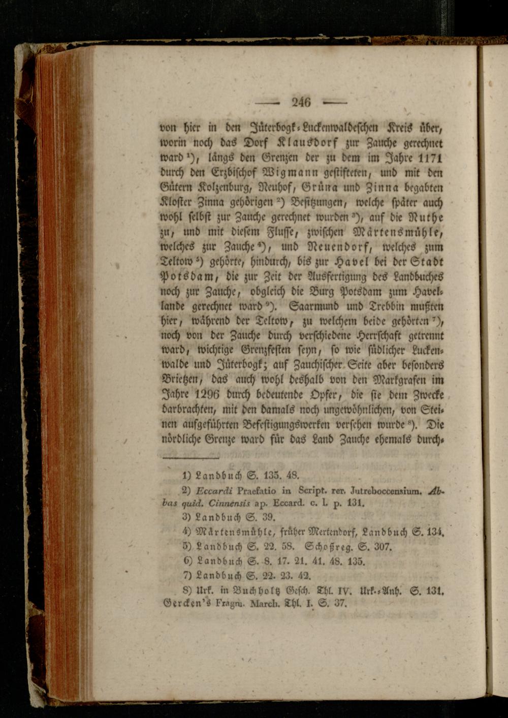 von hier in dm Jüterbogk. Lucken waldeschm Kreis über, worin noch das Dorf Klausdorf zur Zalkche gerechnet ward'), längs den Grenzen der zu dem im Jahre 1171 durch dm Erzbischof Wigmann gestifteten, und mit dm Gutem Kolzmburg, Neuhof, Grüna und Zinna begabten Kloster Zinna gehörigen ') Besitzungen, welche später auch wohl selbst zur Zauche gerechnet wurden'), auf die Nuthe zu, und mit diesem Flusse, zwischen Märtensmühle, welches zur Zauche*), und Neuendorf, welches zum Teltow') gehörte, hindurch, bis zur Havel bei der Stadt Potsdam, die zur Zeit der Ausfertigung des kandbuchrs noch zur Zauche, obgleich die Burg Potsdam zum Havel- lande gerechnet ward'). Saarmund und Trebbin mußten hier, während der Teltow, zu welchem beide gehörten'), noch von der Zauche durch verschiedene Herrschaft getrennt ward, wichtige Grenzfesten seyn, so wie südlicher Lucken« Walde und Jüterbogk; auf Zauchischer Seite aber besonders Brietzm, das auch wohl deshalb von den Markgrafen im Jahre 1296 durch bedeutende Opfer, die sie dem Zwecke darbrachten, mit dm damals noch ungewöhnlichen, von Stei» nen aufgeführten Befestigungswerken versehen wurde'). Die nördliche Grenze ward für das Land Zauche ehemals durch.
