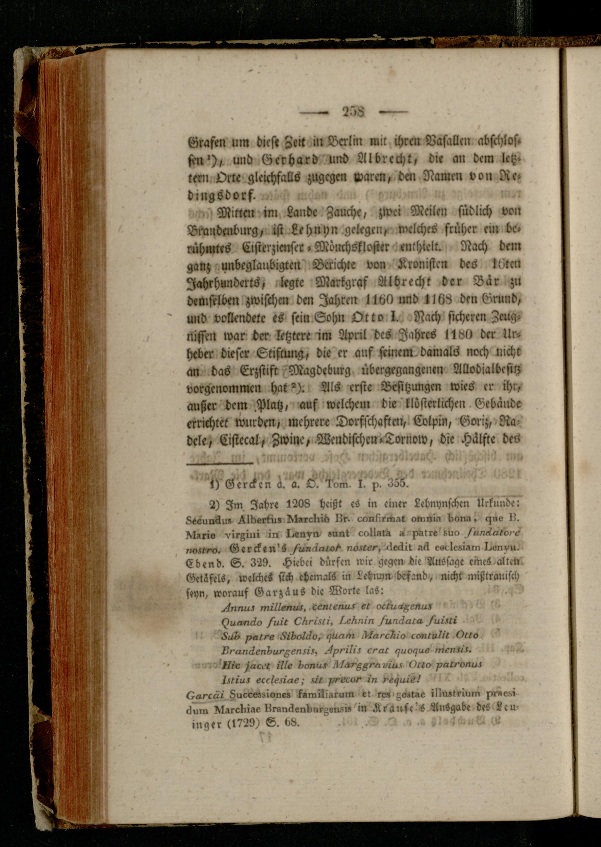 Mitten im Lande Zauche, zwei Meilen südlich von Brandenburg, ist Lehnyn gelegen, welches früher em bc. rühmtts Cisterzienser. Mönchskloster enthielt. Nach dem ganz unbeglaubigten Berichte von Kronistcn des It-tcn Jahrhunderts, legte Markgraf Ai brecht der Bär zu demselben zwischen dm Jahren 1160 und 1168 den Grund, und vollendete es sein Sohn Otto I. Nach sicheren Zeugnissen war der letztere im April des Jahres 1180 der Urheber dieser Stiftung, die er ans seinem damals noch nicht an das Erzstist Magdeburg übrrgegangenm Modialbcsttz vorgenommcn hat"). Als erste Besitzungen wies er ihr, außer dem.Platz, auf welchem die klösterlichen Gebäude errichtet wurden, mehrere Dorsschaften, Coipin, Gorch Radele, Cistecal, Zwine, Wendischen-Tornow, die Hälfte des