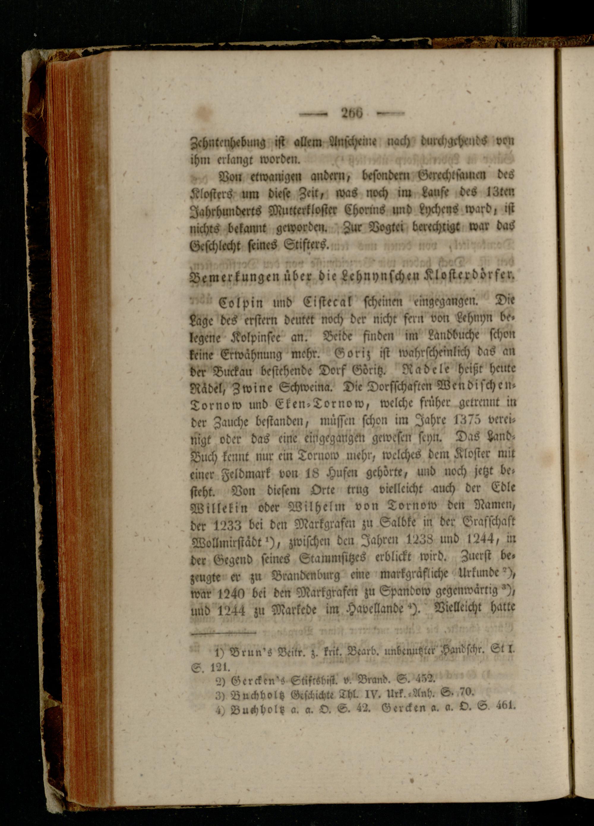 Colpin und Eistecak scheinen eingegangen. Dir Lage des erstem deutet noch der nicht fern von Lehnyn be. kegene Kölpinsee an. Beide finden im Landbuche schon keine Erwähnung mehr. Goriz ist wahrscheinlich das an der Duckau bestehende Dorf Göritz. Radele heißt heute Rädel, Zwine Schweina. Die Dorsschaften Wendischen» Tornow und Eken.Tornow, welche fniher getrennt in der Zauche bestanden, müssen schon im Jahre 1375 vereinigt oder das eine cingegangen gewesen scyn. Das Zand- Buch kennt nur ein Tornow mehr, welches dem Kloster mit einer Feldmark von 18 Hufen gehörte, und noch jetzt be» steht. Von diesem Orte trug vielleicht auch der Edle Willekin oder Wilhelm von Tornow den Namen, der 1233 bei den Markgrafen zu Salbke in der Grafschaft Wollmirstädt'), zwischen den Jahren 1238 und 1244, in der Gegend seines Stammsitzes erblickt wird. Zuerst be« zeugte er zu Brandenburg eine markgräfiiche Urkunde'), war 1240 bei den Markgrafen zu Spandow gegenwärtig"), und 1244 zu Markcde im Havellande -). Vielleicht hatte