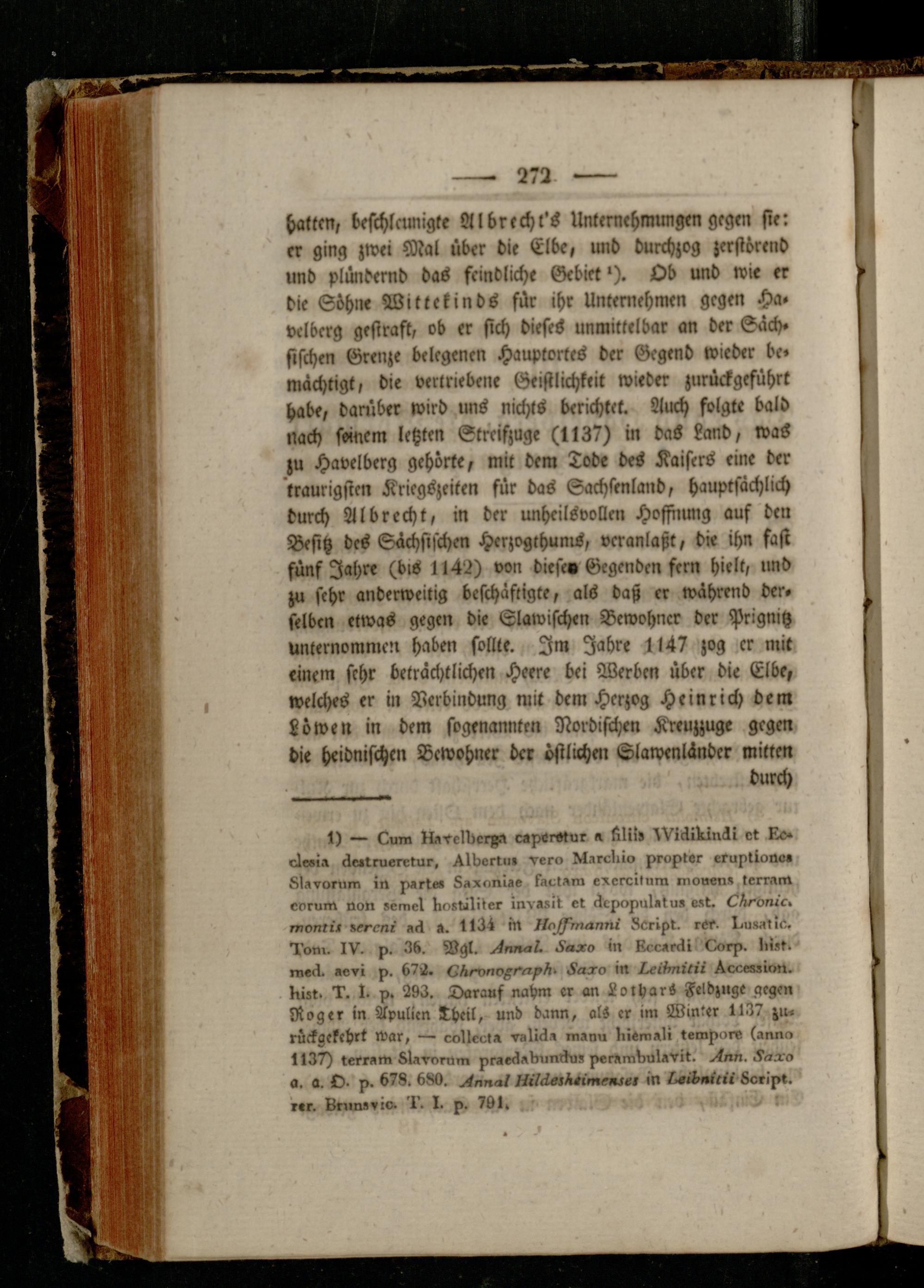 hatten, beschleunigt« Albrechr's Unternehmungen gegen sie: er ging zwei Mal über die Elbe, und durchzog zerstörend und plündernd das feindliche Gebiet'). Ob und wie er die Söhn« Wittekinds für ihr Unternehmen gegen Ha. velbcrg gestraft, ob er sich diefeS unmittelbar an der Säch. fischen Grenze belegenen Hauptortes der Gegend wieder be« mächtigt, die vertriebene Geistlichkeit wieder zurückgeführt habe, darüber wird uns nichts berichtet. Auch folgte bald nach seinem letzten Streifzuge (1137) in daS Land, waS zu Havelberg gehörte, mit dem Tode des Kaisers eine der traurigsten Kriegszeiten für dos Sachsenland, hauptsächlich durch Al brecht, in der unheilsvollcn Hoffnung auf deu Besitz des Sächsischen Herzogthunrs, veranlaßt, die ihn fast fünf Jahre (bis 1142) von diese» Gegenden fern hielt, und zu sehr anderweitig beschäftigte, als daß er während der. selben etwas gegen die Slawischen Bewohner der Prignitz unternommen haben sollte. Im Jahre 1147 zog er mit einem sehr beträchtlichen Heere bei Werben über die Elbe, welches er in Verbindung mit dem Herzog Heinrich dem Löwen in dem sogenannten Nordischen Kreuzzuge gegen die heidnischen Bewohner der östlichen Slawenländcr mitten