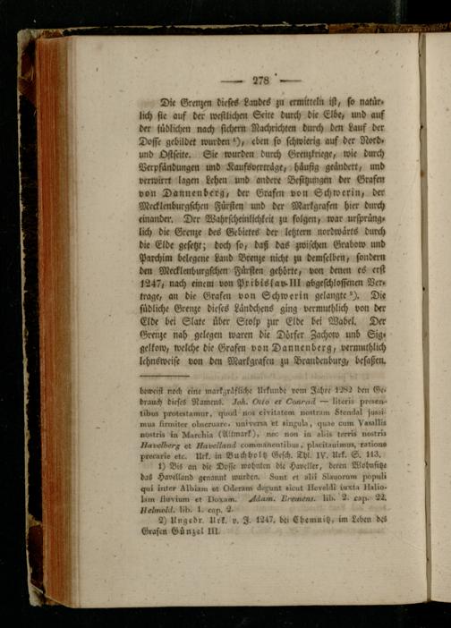 Die Grenzen dieses Landes zu ermitteln ist, so natür» lich sie auf der westliäM Seite durch die Elbe, und auf der südlichen nach sichern Nachrichten durch den Lauf der Dosse gebildet wurden'), eben so schwierig auf der Nord« und Ostscite. Sie wurden durch Grenzkriege, wie durch Verpfändungen und Kaufsverträge, häufig geändert, und verwirrt lagen Lehe» und andere Besitzungen der Grafen von Dannenberg, der Grafen von Schwerin, der Mecklcnburgschcn Fürsten und der Markgrafen hier durch einander. Der Wahrscheinlichkeit ju folgen, war ursprüng» lich die Grenze des Gebietes der letztem nordwärts durch die Elde gesetzt; doch so, daß bas zwischen Grabow und Parchim belegen? Land Brenzc nicht zu demselben, sondern den Mecklenburgschen Fürsten gehörte, von denen es erst 1247, nach einem von Pribislav-Ill abgeschlossenen Vcr« trage, an die Grafen von Schwerin gelangte'). Die südliche Grenze dieses Ländchens ging vermuthlich von der Elde bei Slate über Stolp zur Elde bei Wabcl. Der Grenze nah gelegen waren die Dörfer Zachow unb Sig» gelkow, welche die Grafen von Dannenberg, vermuthlich lchnsweise von den Markgrafen zu Brandenburg, besaßen.