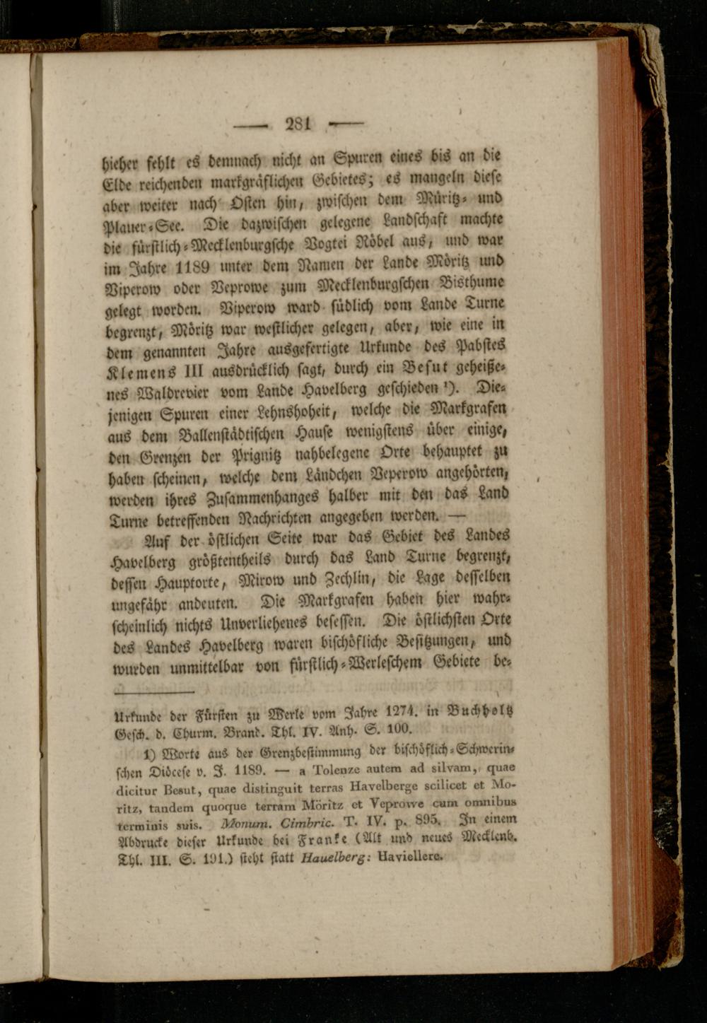 hieher fehlt cs demnach nicht an Spuren eines bis an die Eide reichenden markgräflicl-en Gebietes; es mangeln diese aber weiter nach Osten hin, zwischen dem Müritz, und Piamr»See. Die dazwifchm gelegene Landschaft machte die fürstlich «Mecklcnburgsche Vogtci Röbel aus, und war im Jahre 1189 linker dem Namen der Lande Möritz und Dipcrow oder Vcprowe zum Mecklenburgschen Bisthume gelegt worden. Vipcrow ward südlich vom Lande Turne begrenzt, Möritz war westlicher gelegen, aber, wie eine in dem genannte!, Jahre ausgefertigte Urkunde des Pabstes Klemens III ausdrücklich sagt, durch ein Besut geheiße- nes Waldrevier vom Lande Havelberg geschieden'). Diejenigen Spuren einer Lehnshoheit, welche die Markgrafen aus dem Ballenstädtischen Hause wenigstens über einige, den Grenzen der Prignitz nahbelegene Orte behauptet zu haben scheinen, welche dem Landen Aeperow angehörten, wer^den ihres Zusammenhanges halber mit den das Land Turne betreffenden Nachrichten angegeben werden. —