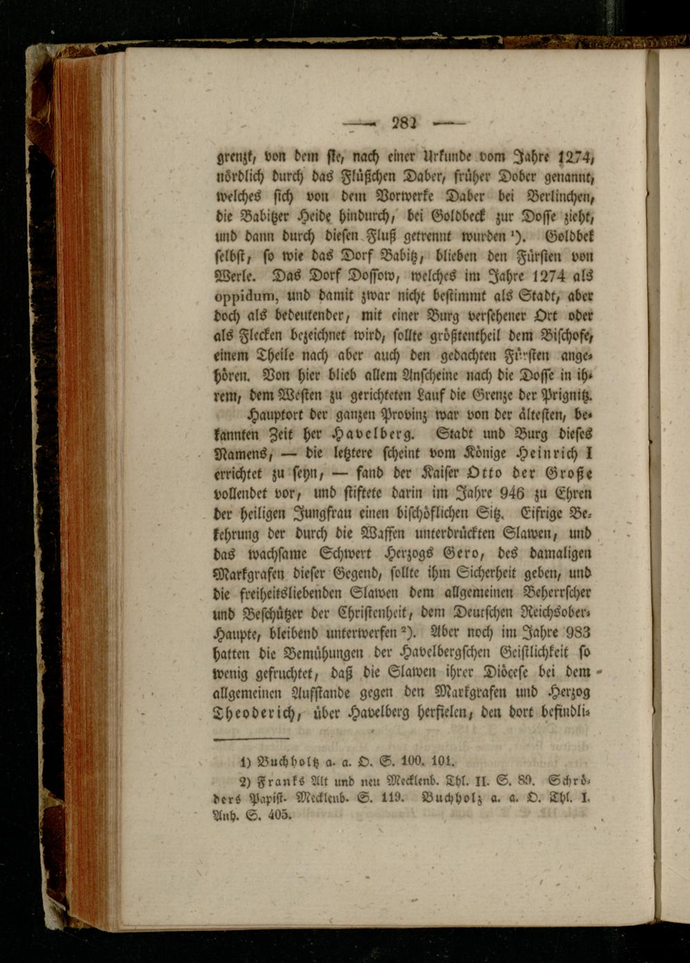 grenzt, von dein fle, nach einer Urkunde vom Jahre 1274, nördlich durch das Flüßchen Daber, früher Dobcr genannt, welches sich von dem Vorwerke Daber bei Berlinchen, die Babitzer Heide hindurch, bei Goldbeck zur Dosse zieht, und dann durch diesen Fluß getrennt wurden'). Goldbck selbst, so wir das Dorf Babitz, blieben den Fürsten von Werke. Das Dorf Dossow, welches im Jahre 1274 als vppiäum, und damit zwar nicht bestimmt als Stadt, aber doch als bedeutender, mit einer Burg versehener Ott oder als Flecken bezeichnet wird, sollte größtentheil dem Bischöfe, einem Theile nach aber auch den gedachten Fürsten ange, hören. Don hier blieb allem Anscheine nach die Dosse in ih» rem, dem Westen zu gerichteten Lauf die Grenze der Prignitz.