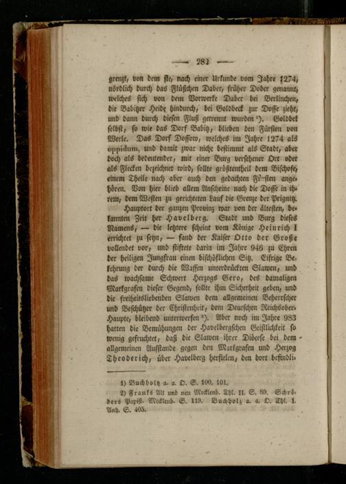 Hauptort der ganzen Provinz war von der ältesten, be« kannten Zeit her Havelberg. Stadt und Burg dieses Namens, — die letztere scheint vom Könige Heinrich I errichtet zu seyn, — fand der Kaiser Otto der Große vollendet vor, und stiftete darin im Jahre 946 zu Ehren der heiligen Jungfrau einen bischöflichen Sitz. Eifrige Bekehrung der durch die Waffen unterdrückten Slawen, und das wachsame Schwert Herzogs Gero, des damaligen Markgrafen dieser Gegend, sollte ihm Sicherheit geben, und die freiheitsliebenden Slawen dem allgemeinen Beherrscher und Beschützer der Christenheit, dem Deutschen Rcichsober, Haupte, bleibend unterwerfen -). Aber noch im Jahre 983 hatten die Bemühungen der Havelbergschen Geistlichkeit so wenig gefruchtet, daß die Slawen ihrer Diöcese bei dem - allgemeinen Aufstande gegen den Markgrafen und Herzog Theo der ich, über Havelberg herfielcn, den dort befnidli»