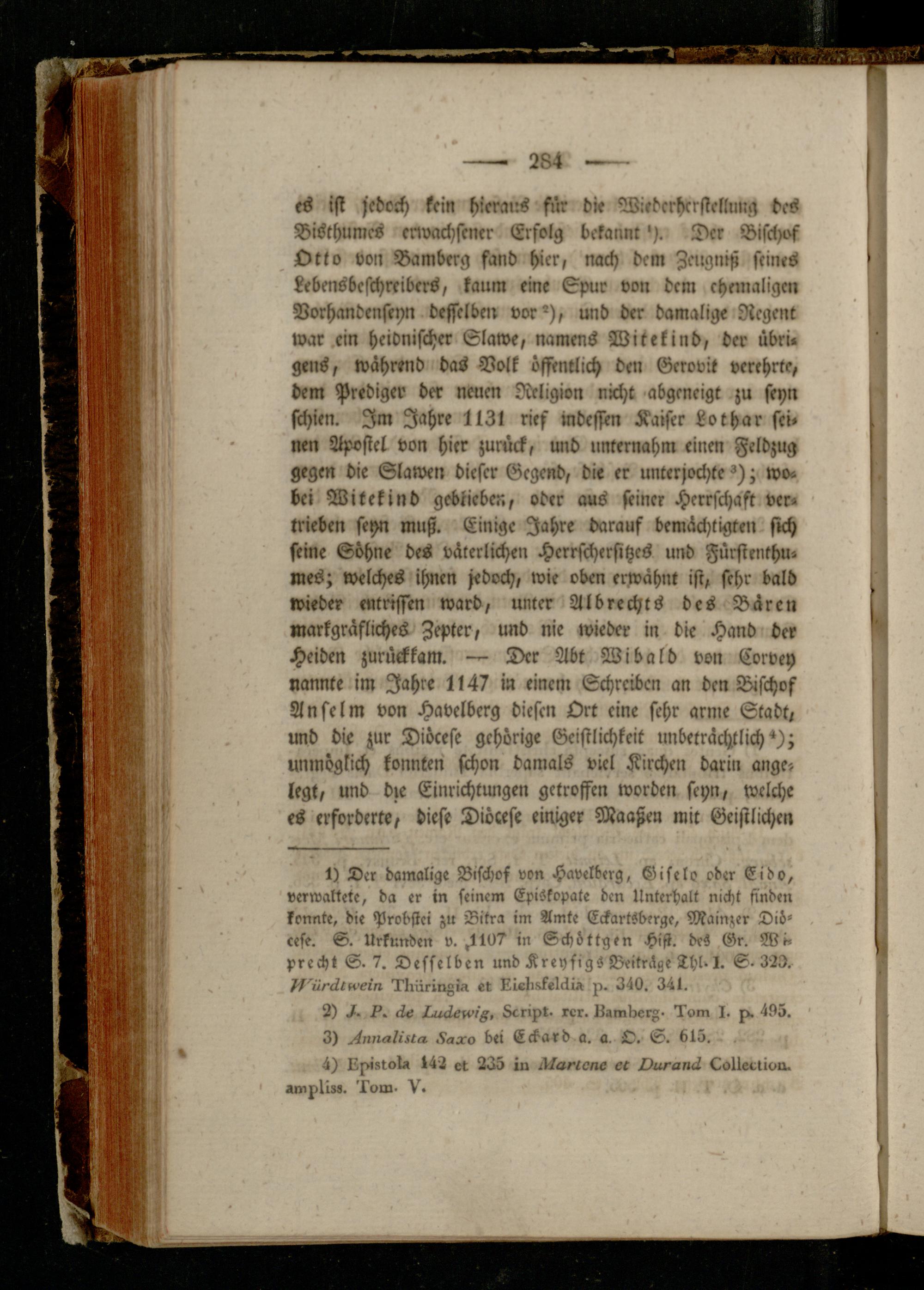 es ist jedoch kein hieraus für die Wiederherstellung des Bisthumes erwachsener Erfolg bekanntDer Biscl)vf Otto von Bamberg fand hier, nach dem Zrngniß seines kebensbeschreibers, kaum eine Spur von dem ehemaligen Borhandensryn desselben vor'), und der damalig« Regent war ein heidnischer Slawe, namens Witekind, der übri. gens, während das Volk öffentlich den Gerovit verehrte, dem Prediger der neuen Religion nicht abgeneigt zu seyn schien. Im Jahre 1131 rief indessen Kaiser Lothar sei« nen Apostel von hier zurück, und unternahm einen Feldzug gegen die Slawen dieser Gegend, die er unterjochte; wo« bei Witekind geblieben, oder aus seiner Herrschaft vertrieben seyn muß. Einige Jahre darauf bemächtigten sich seine Söhne des väterlichen Hcrrschersitzes und Fürstenthu- mes; welches ihnen jedoch, wie oben erwähnt ist, sehr bald wieder entrissen ward, unter Albrechts des Bären markgräfliches Zepter, und nie wieder in die Hand der Heiden zurückkam. — Der Abt Wibald von Corvey nannte im Jahre 1147 in einem Schreiben an den Bischof Anselm von Havelberg diesen Ort eine sehr arme Stadt, und die zur Diöcese gehörige Geistlichkeit unbeträchtlich *); unmöglich konnten schon damals viel Kirchen darin angelegt, und b»e Einrichtungen getroffen worden seyn, welche es erforderte, diese Diöcese einiger Maaßeu mit Geistlichen