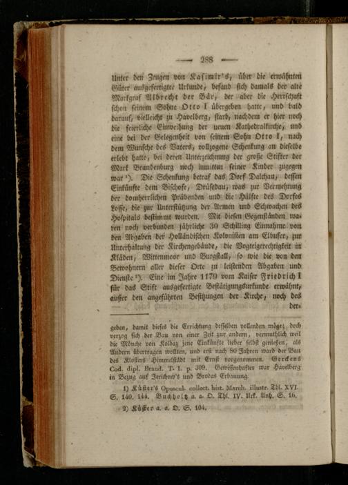 geben, damit dieses die Errichtung desselben vollenden möge; doch verzog sich der Bau von einer Zeit zur andern, vermuthlich weil die MLnche von Kolbaz jene Einkünfte lieber selbst genießen, als Andern übertragen wollten, und erst nach 80 Jahren ward der Ban des Klosters Himmelstädt mit Ernst vorgenommen. GerckenS eoä. äss,I. Sranei. I'. 7. p. 309. Gewissenhafter war Havtlberg in Bezug auf Jerichvw'S und Brodas Erbauung.