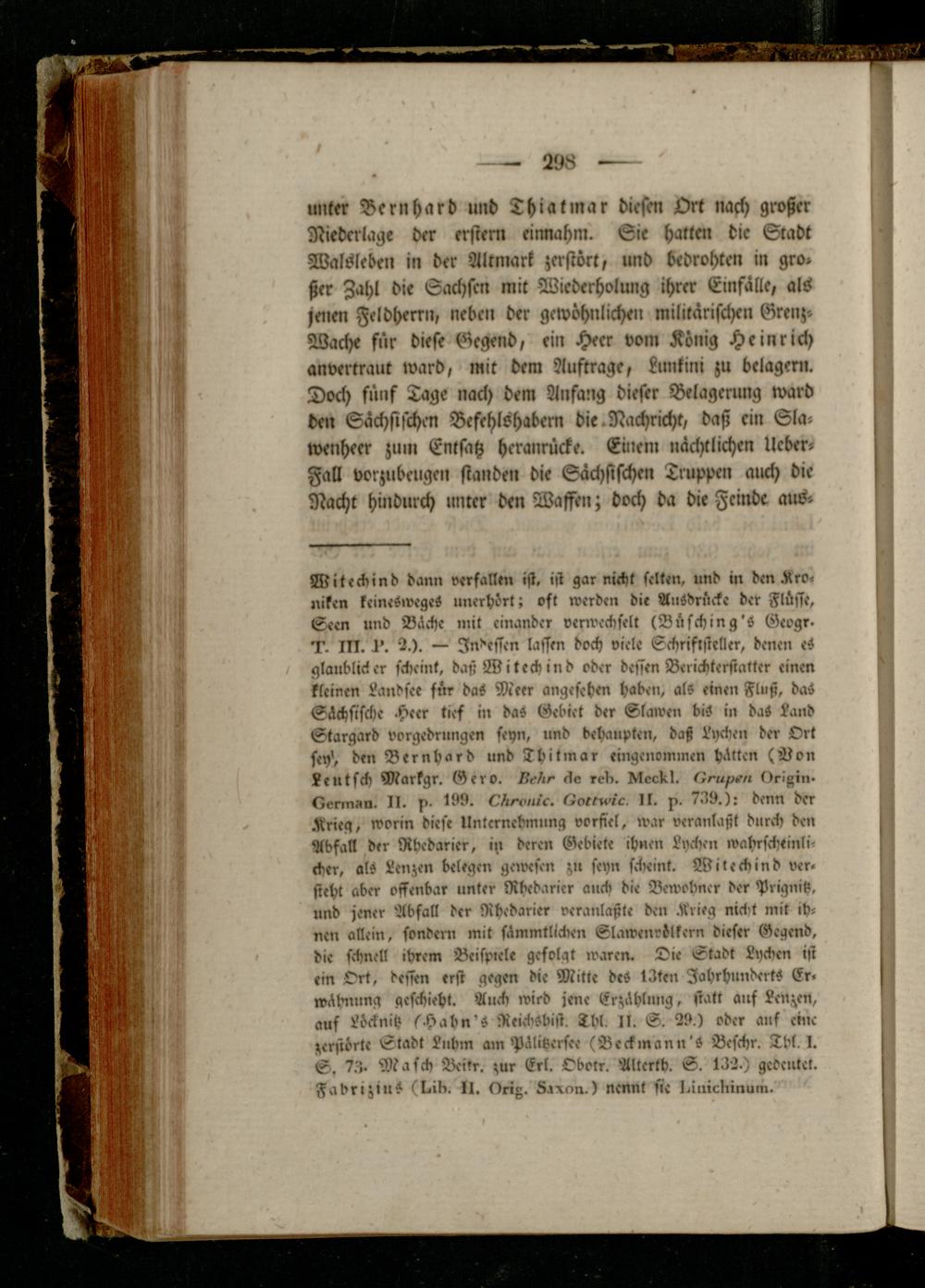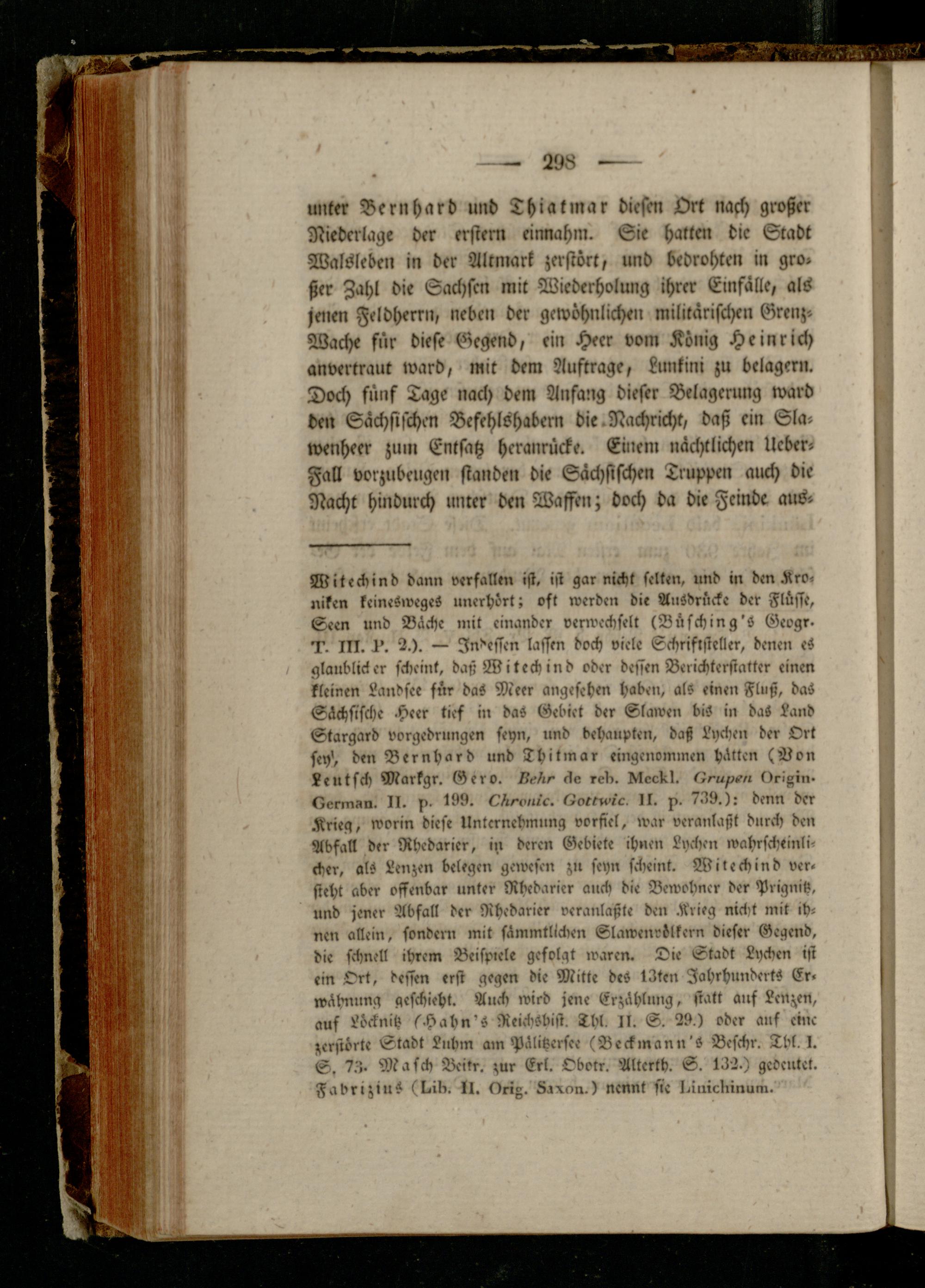 Witeckind dann verfallen ist, ist gar nicht selten, und in den Kro- niken kcinesweges unerhört; oft werden die Ausdrücke der Flüsse, Seen und Bäche mit einander verwechselt (Büsching'S Geogr- 1'. III. I'. 2.). — Indessen lasten doch viele Schriftsteller, denen es glaublicier scheint, daß Witechind oder besten Berichterstatter einen kleinen Landsee für das Meer angesehen habe», als einen Fluß, das Sächsische Heer tief in das Gebiet der Slawen bis in daS Land Starqard vorgedrungen feyn, und behaupten, daß Lychen der Ort sey', den Bernhard und Thitmar eingenommen hätten (Bon Leut sch Markgr. Gero, /?a/rr kle rel>. d»tc<RI, Orißin-