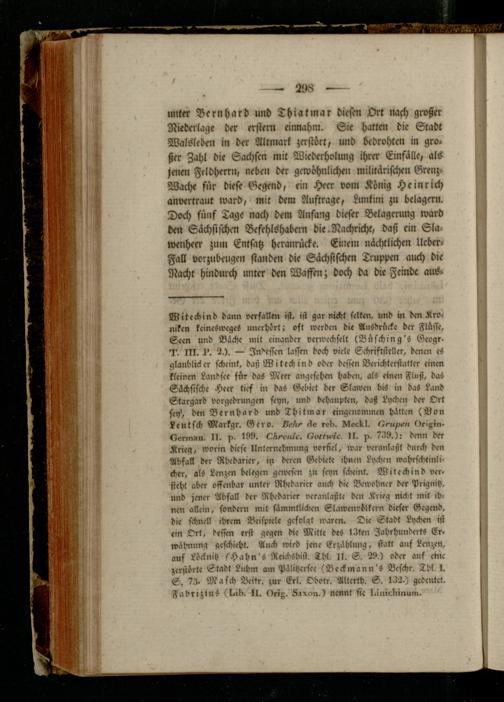 Krieg, worin diese Unternehmung verfiel, war veranlaßt durch den Abfall der Rhedarier, in deren Gebiete ihnen Luchen wahrscheinlicher, als Lenzen belegen gewesen zu feyn scheint. Wiiechind versieht aber offenbar unter Rhedarier auch die Bewohner der Prignil?, und jener Abfall der Rhedarier veranlaßt« den Krieg nickt mit ihnen allein, sondern mit fämmtlicken Slawenvölkern dieser Gegend, die schnell ihrem Beispiele gefolgt waren. Die Stadt Lychen ist ein Ort, besten erst gegen die Mitte des tüten Jahrhunderts Erwähnung geschieht. Auch wird jene Erzählung, statt auf Lenzen, auf Löcknitz <Hahn's Reichsbist, Tbl, II. S. 29 ) oder ans eine zerstörte Stadt Lubm am Pälitzersee (Beck mann'S Bcschr. Tbl, I. S. 7,'l. Mafch Leikr. zur Erl. Obotr. Älterth. S, 1Ü2.) gedeutet. Fabrizios (l-ilr. II. Orig. 8axou.) nennt sie l-inicliinum.
